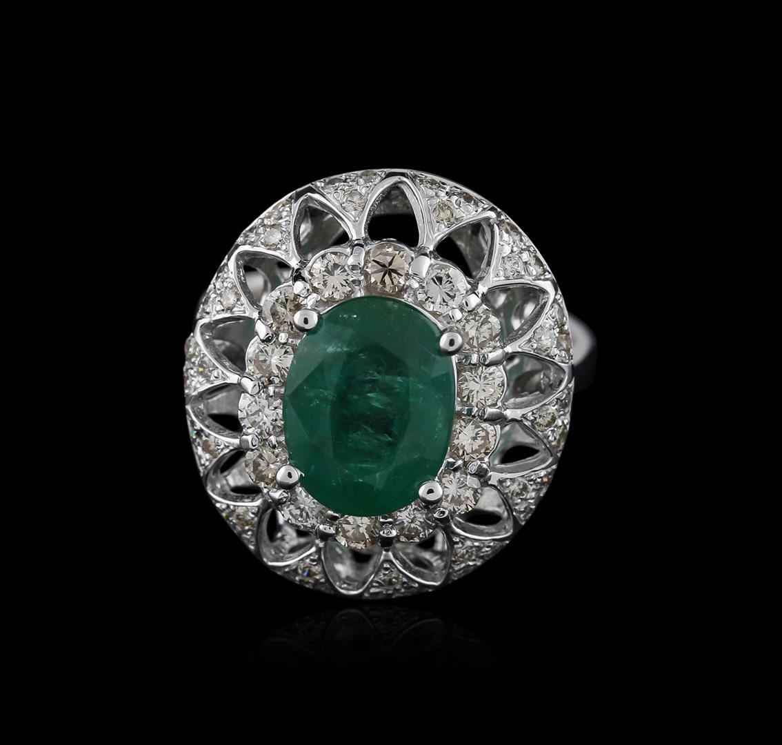 One electronically tested 14KT white gold ladies cast emerald and diamond ring with a cathedral shank with a bright polish finish. Identified with markings of "K14". Condition is new. Containing: One prong set oval modified brilliant cut natural emerald, measuring 10.56 x 8.14 x 5.30mm, approximate weight of 2.60 ct., clarity is heavily included, type III, medium light, very slightly grayish, green color, (GIA G 4/3), cut is good. Fourteen prong set round brilliant cut diamonds, measuring 2.40 - 2.40 x 1.44mm (depth est.) approximate total weight of 14 Stones = 0.71ct. Clarity: SI-1. Color: J - K, Cut is Good. Forty-Five round brilliant cut diamonds, measuring 1.30 - 1.30 x 0.78mm (depth est.) approximate total weight of 45 Stones = 0.36ct. Clarity: SI-1 to I-1. Color: I - J, Cut is Good. All diamonds and colored gemstones are graded in the mounting, unless otherwise stated. Colored gemstones are presumed to have been subjected to commonly used enhancement processes.. Total Weight of Colored Stones 2.60 ct. Total Weight of Diamonds 1.07ct. Total Weight of Ring 7.70 grams. GGL Appraised.
