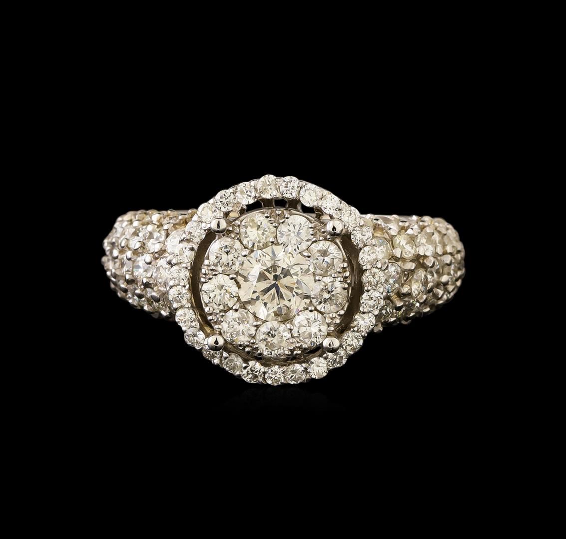 One electronically tested 14KT white gold ladies cast diamond ring with a bright polish finish. The ring features an organized diamond cluster set within a diamond bezel supported by diamond set shoulders, completed by a three millimeter wide band. Identified with markings of "14K". Condition is new, good workmanship. Containing: One prong set round brilliant cut diamond, measuring 4.80 - 4.70 x 3.04mm (depth est.) approximate weight of 0.42ct. Graded in the setting. Clarity: I-1. Color: H Sixty-Five prong set round brilliant cut diamonds, measuring 2.00 - 1.90 x 1.17mm (depth est.) approximate total weight of 65 Stones = 1.86ct. Graded in the setting. Clarity: SI-1 to I-1. Color: G - I Twenty-Seven prong set round brilliant cut diamonds, measuring 1.40 - 1.30 x 0.81mm (depth est.) approximate total weight of 27 Stones = 0.34ct. Graded in the setting. Clarity: SI-1 to I-1. Color: G - I. Total Weight of Diamonds 2.62ct. Total Weight of Ring 6.38 grams. AIG Appraised.