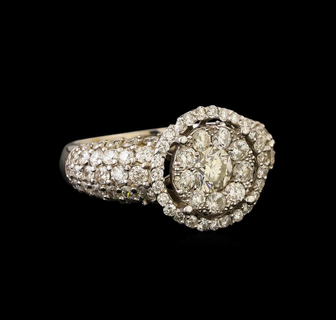 One electronically tested 14KT white gold ladies cast diamond ring with a bright polish finish. The ring features an organized diamond cluster set within a diamond bezel supported by diamond set shoulders, completed by a three millimeter wide band. Identified with markings of "14K". Condition is new, good workmanship. Containing: One prong set round brilliant cut diamond, measuring 4.80 - 4.70 x 3.04mm (depth est.) approximate weight of 0.42ct. Graded in the setting. Clarity: I-1. Color: H Sixty-Five prong set round brilliant cut diamonds, measuring 2.00 - 1.90 x 1.17mm (depth est.) approximate total weight of 65 Stones = 1.86ct. Graded in the setting. Clarity: SI-1 to I-1. Color: G - I Twenty-Seven prong set round brilliant cut diamonds, measuring 1.40 - 1.30 x 0.81mm (depth est.) approximate total weight of 27 Stones = 0.34ct. Graded in the setting. Clarity: SI-1 to I-1. Color: G - I. Total Weight of Diamonds 2.62ct. Total Weight of Ring 6.38 grams. AIG Appraised.