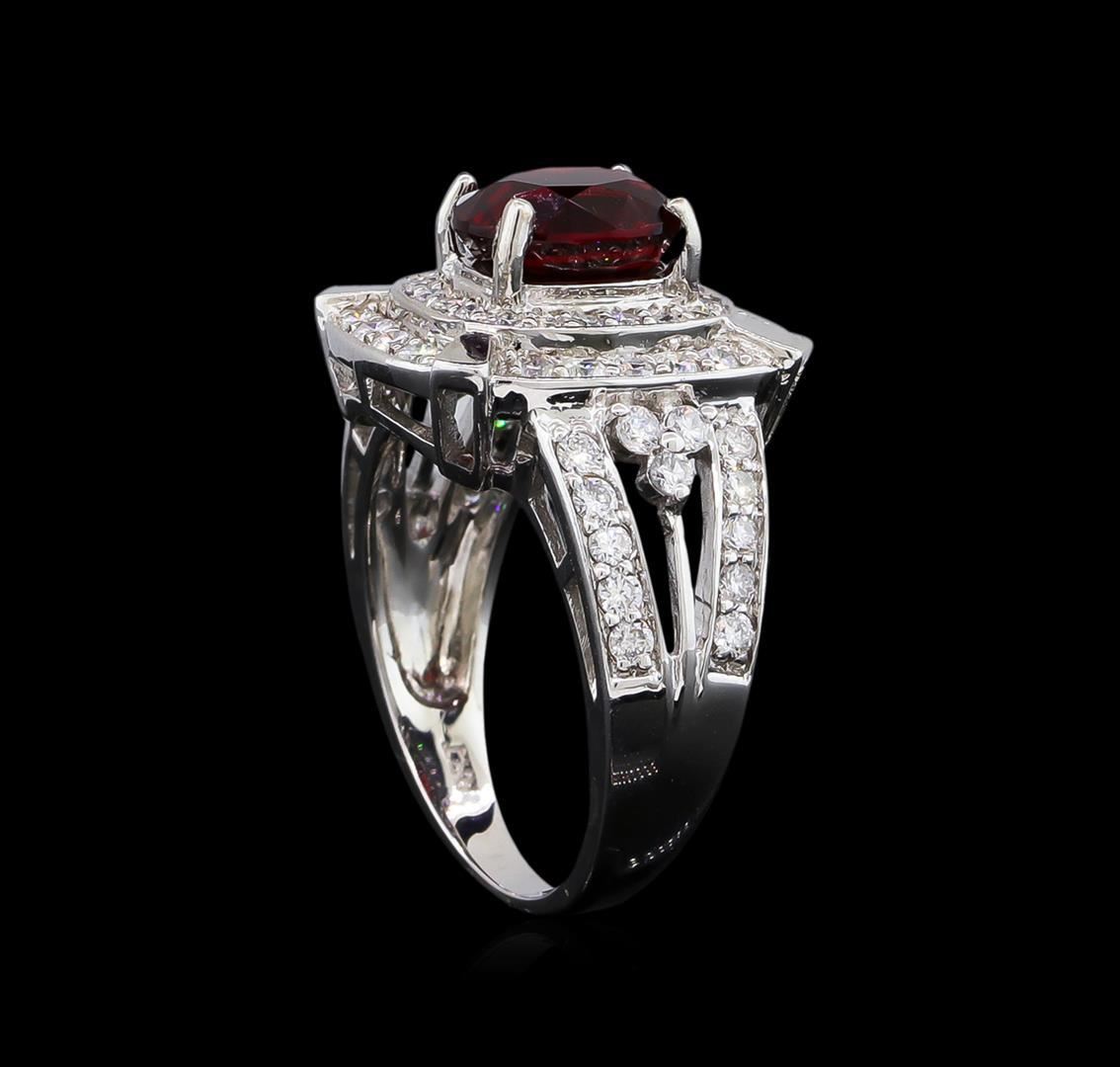 One electronically tested 14KT white gold Ladies combination cast & assembled ballerina ring with a bright polish finish. Condition is excellent. Containing: One prong set oval modified brilliant cut natural red spinel, measuring 8.40 x 7.60 x 5.80mm, approximate weight of 2.67ct., clarity is eye clean, type II, medium dark, moderately strong, orangy red color, (GIA oR 6/4), cut is good. Colored gemstones are presumed to have been subjected to commonly used and possible undetectable color/clarity enhancement processes. Sixty-Four prong set round brilliant cut diamonds, measuring 1.60 - 1.60 x 0.96mm (depth est.) approximate total weight of 64 Stones = 0.95ct. Clarity of SI-2 to I-1, Color of G - H, Cut is Good. Total Weight of Colored Stones 2.67ct. Total Weight of Diamonds 0.95ct. Total Weight of Ring 6.00gm. GGL Appraised.