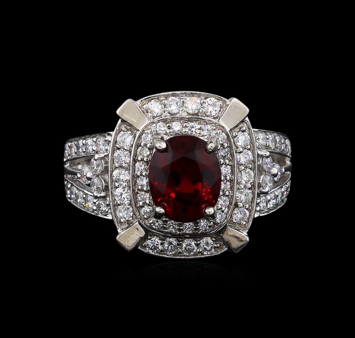 One electronically tested 14KT white gold Ladies combination cast & assembled ballerina ring with a bright polish finish. Condition is excellent. Containing: One prong set oval modified brilliant cut natural red spinel, measuring 8.40 x 7.60 x 5.80mm, approximate weight of 2.67ct., clarity is eye clean, type II, medium dark, moderately strong, orangy red color, (GIA oR 6/4), cut is good. Colored gemstones are presumed to have been subjected to commonly used and possible undetectable color/clarity enhancement processes. Sixty-Four prong set round brilliant cut diamonds, measuring 1.60 - 1.60 x 0.96mm (depth est.) approximate total weight of 64 Stones = 0.95ct. Clarity of SI-2 to I-1, Color of G - H, Cut is Good. Total Weight of Colored Stones 2.67ct. Total Weight of Diamonds 0.95ct. Total Weight of Ring 6.00gm. GGL Appraised.