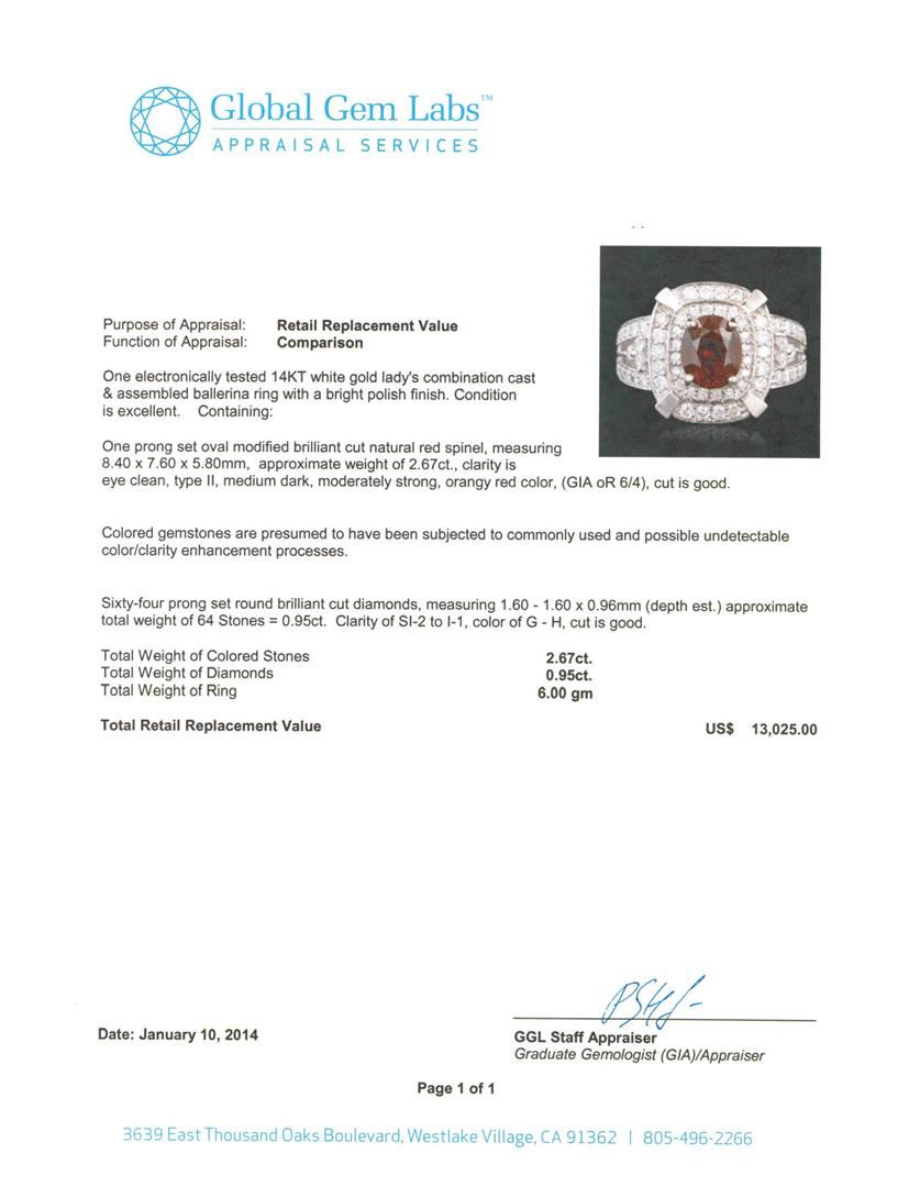 One electronically tested 14KT white gold Ladies combination cast & assembled ballerina ring with a bright polish finish. Condition is excellent. Containing: One prong set oval modified brilliant cut natural red spinel, measuring 8.40 x 7.60 x 5.80mm, approximate weight of 2.67ct., clarity is eye clean, type II, medium dark, moderately strong, orangy red color, (GIA oR 6/4), cut is good. Colored gemstones are presumed to have been subjected to commonly used and possible undetectable color/clarity enhancement processes. Sixty-Four prong set round brilliant cut diamonds, measuring 1.60 - 1.60 x 0.96mm (depth est.) approximate total weight of 64 Stones = 0.95ct. Clarity of SI-2 to I-1, Color of G - H, Cut is Good. Total Weight of Colored Stones 2.67ct. Total Weight of Diamonds 0.95ct. Total Weight of Ring 6.00gm. GGL Appraised.