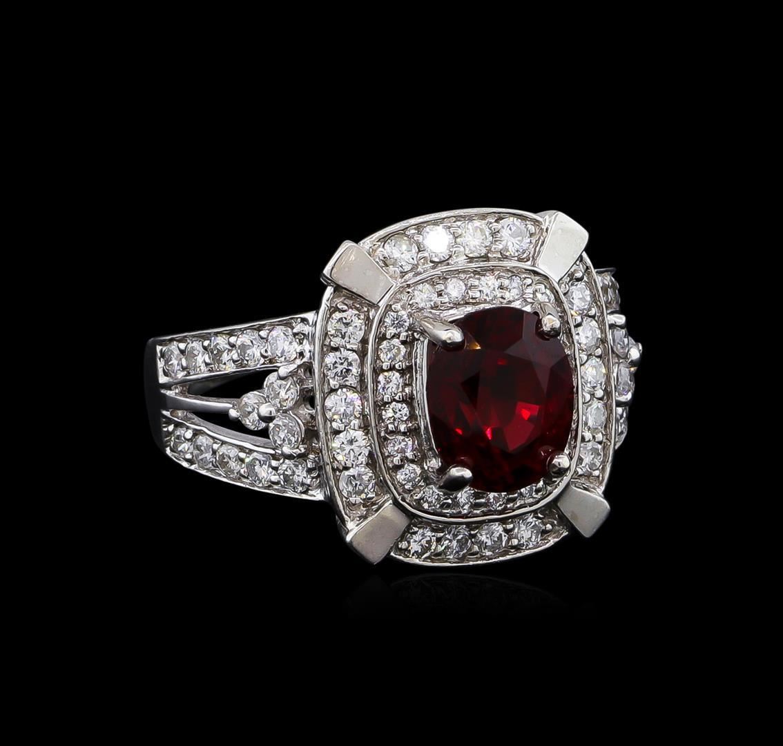 One electronically tested 14KT white gold Ladies combination cast & assembled ballerina ring with a bright polish finish. Condition is excellent. Containing: One prong set oval modified brilliant cut natural red spinel, measuring 8.40 x 7.60 x 5.80mm, approximate weight of 2.67ct., clarity is eye clean, type II, medium dark, moderately strong, orangy red color, (GIA oR 6/4), cut is good. Colored gemstones are presumed to have been subjected to commonly used and possible undetectable color/clarity enhancement processes. Sixty-Four prong set round brilliant cut diamonds, measuring 1.60 - 1.60 x 0.96mm (depth est.) approximate total weight of 64 Stones = 0.95ct. Clarity of SI-2 to I-1, Color of G - H, Cut is Good. Total Weight of Colored Stones 2.67ct. Total Weight of Diamonds 0.95ct. Total Weight of Ring 6.00gm. GGL Appraised.