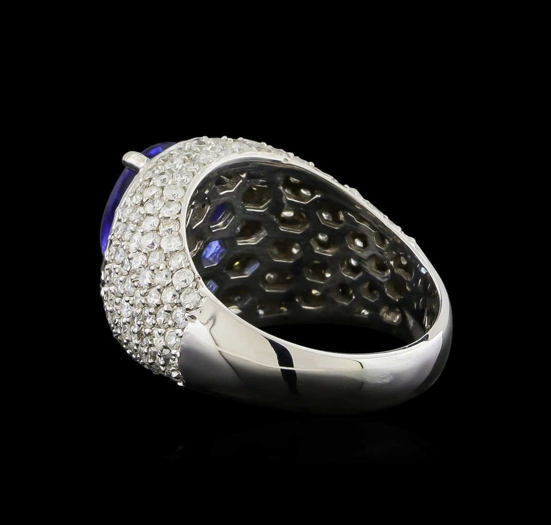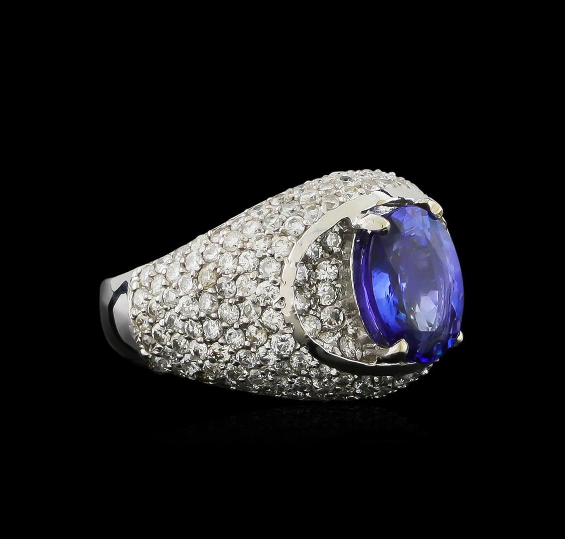 One electronically tested 14KT white gold ladies combination cast & assembled engagement ring with a bright polish finish. Identified with markings of "K14". Condition is new. Containing: One prong set oval modified brilliant cut natural tanzanite, measuring 10.00 x 7.80 x 5.07mm, approximate weight of 2.69ct., clarity is eye clean, type I, medium light, moderately strong, bluish violet color, (GIA bV 4/4), cut is good. One Hundred Sixteen prong set round brilliant cut diamonds, measuring 1.40 - 1.40 x 0.84mm (depth est.) approximate total weight of 116 Stones = 1.16ct. Clarity: SI-1 to I-1. Color: I - J, Cut is Good. Colored gemstones are presumed to have been subjected to commonly used enhancement processes. All diamonds and colored gemstones are graded in the mounting, unless otherwise stated. Total Weight of Colored Stones 2.69ct. Total Weight of Diamonds 1.16ct. Total Weight of Ring 10.00 grams. GGL Appraised.