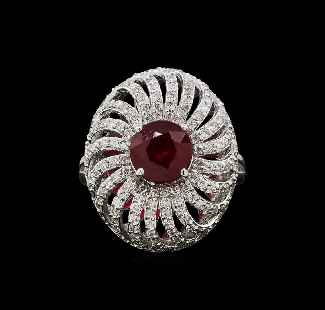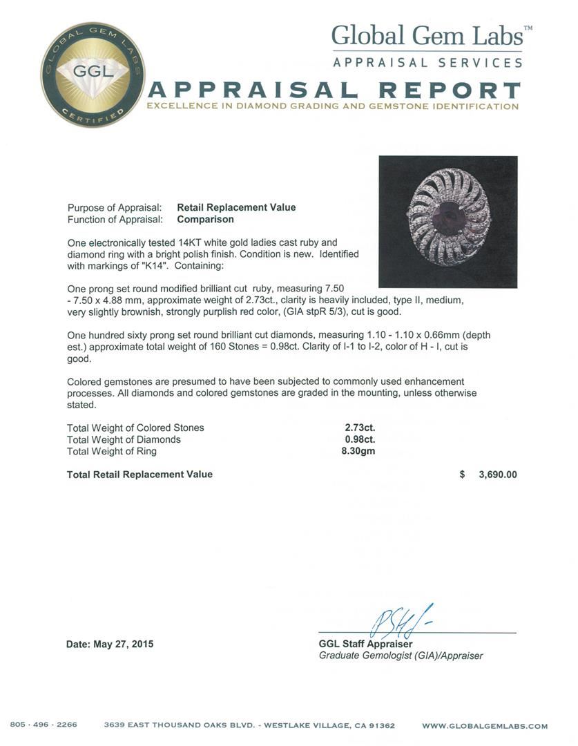 One electronically tested 14KT white gold ladies cast ruby and diamond ring with a bright polish finish. Identified with markings of "K14". Condition is new. Containing: One prong set round modified brilliant cut ruby, measuring 7.50 - 7.50 x 4.88 mm, approximate weight of 2.73ct., clarity is heavily included, type II, medium, very slightly brownish, strongly purplish red color, (GIA stpR 5/3), cut is good. One Hundred Sixty prong set round brilliant cut diamonds, measuring 1.10 - 1.10 x 0.66mm (depth est.) approximate total weight of 160 Stones = 0.98ct. Clarity: I-1 to I-2. Color: H - I, Cut is Good. Colored gemstones are presumed to have been subjected to commonly used enhancement processes. All diamonds and colored gemstones are graded in the mounting, unless otherwise stated. Total Weight of Colored Stones 2.73ct. Total Weight of Diamonds 0.98ct. Total Weight of Ring 8.30 grams. GGL Appraised.