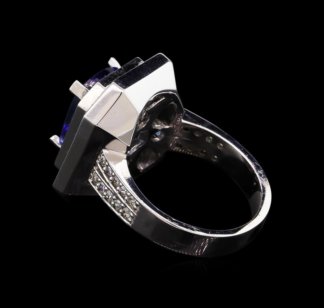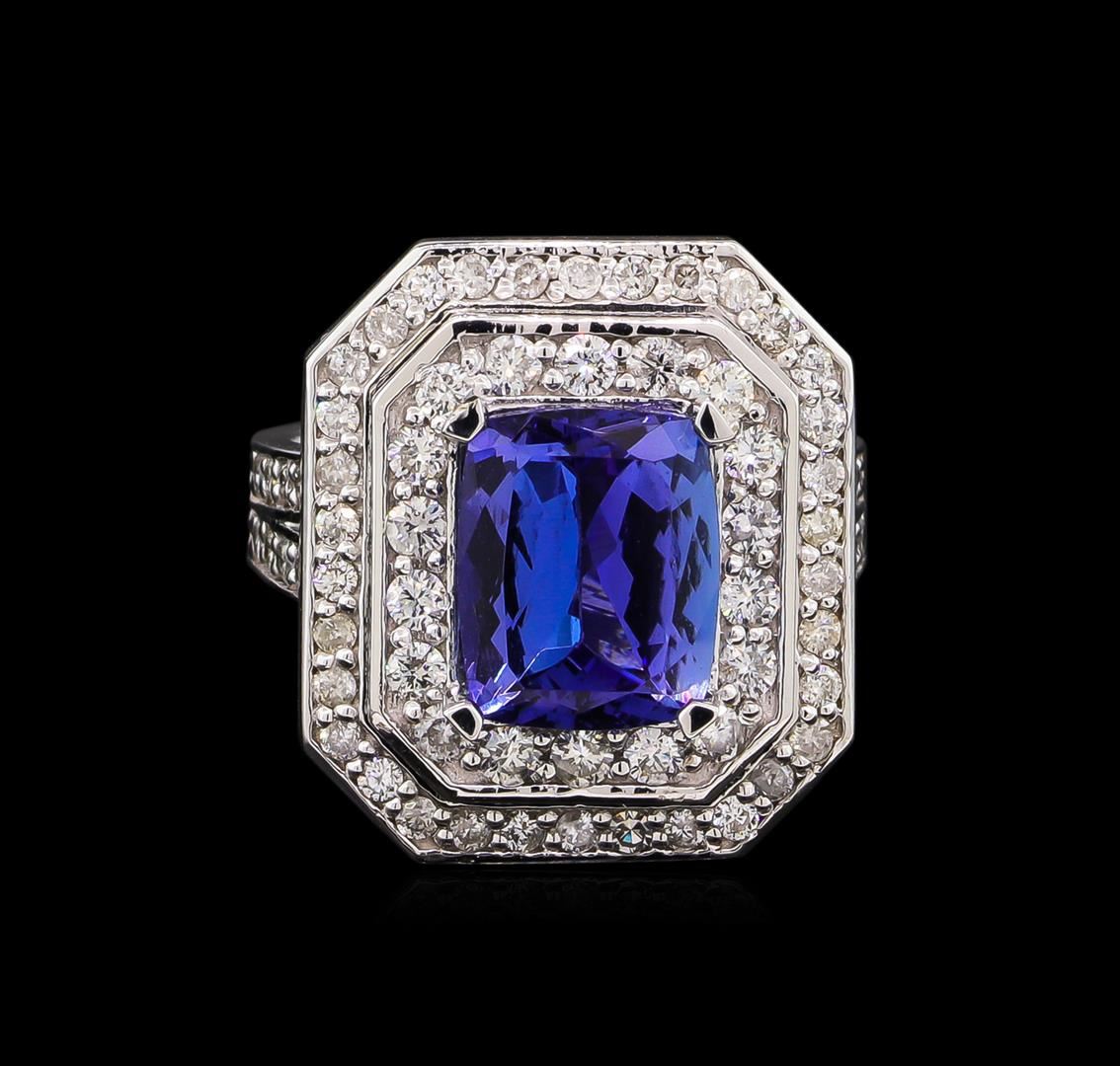 One electronically tested 14KT white gold Ladies combination cast & assembled ring with a bright polish finish. Condition is new. Identified with markings of "14K". Containing: One prong set rectangular cushion modified brilliant cut natural tanzanite, measuring 10.00 x 8.10 x 4.30mm, approximate weight of 2.74ct., clarity is eye clean, type I, medium light, very slightly grayish, violet color, (GIA V 4/3), cut is good. Colored gemstones are presumed to have been subjected to commonly used color/clarity enhancement processes. Seventy-Two prong set round brilliant cut diamonds, measuring 1.80 - 1.50 x 0.99mm (depth est.) approximate. Total Weight of 72 Stones = 1.18ct. Clarity: I-1 to I-2. Color: I - J, Cut is Good. Total Weight of Colored Stones 2.74ct. Total Weight of Diamonds 1.18ct. Total Weight of Ring 12.50 grams. GGL Appraised.