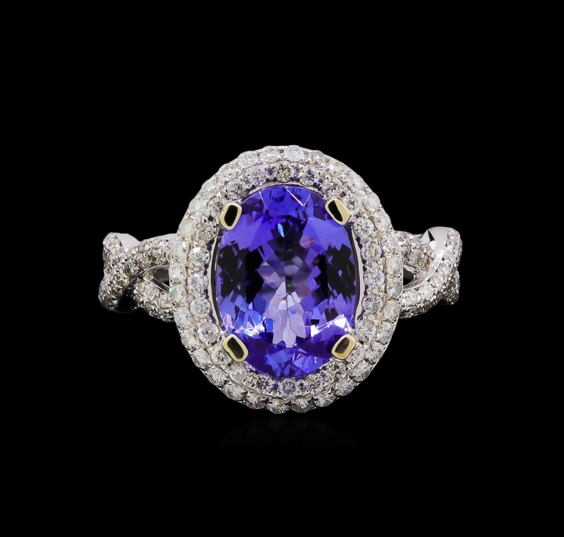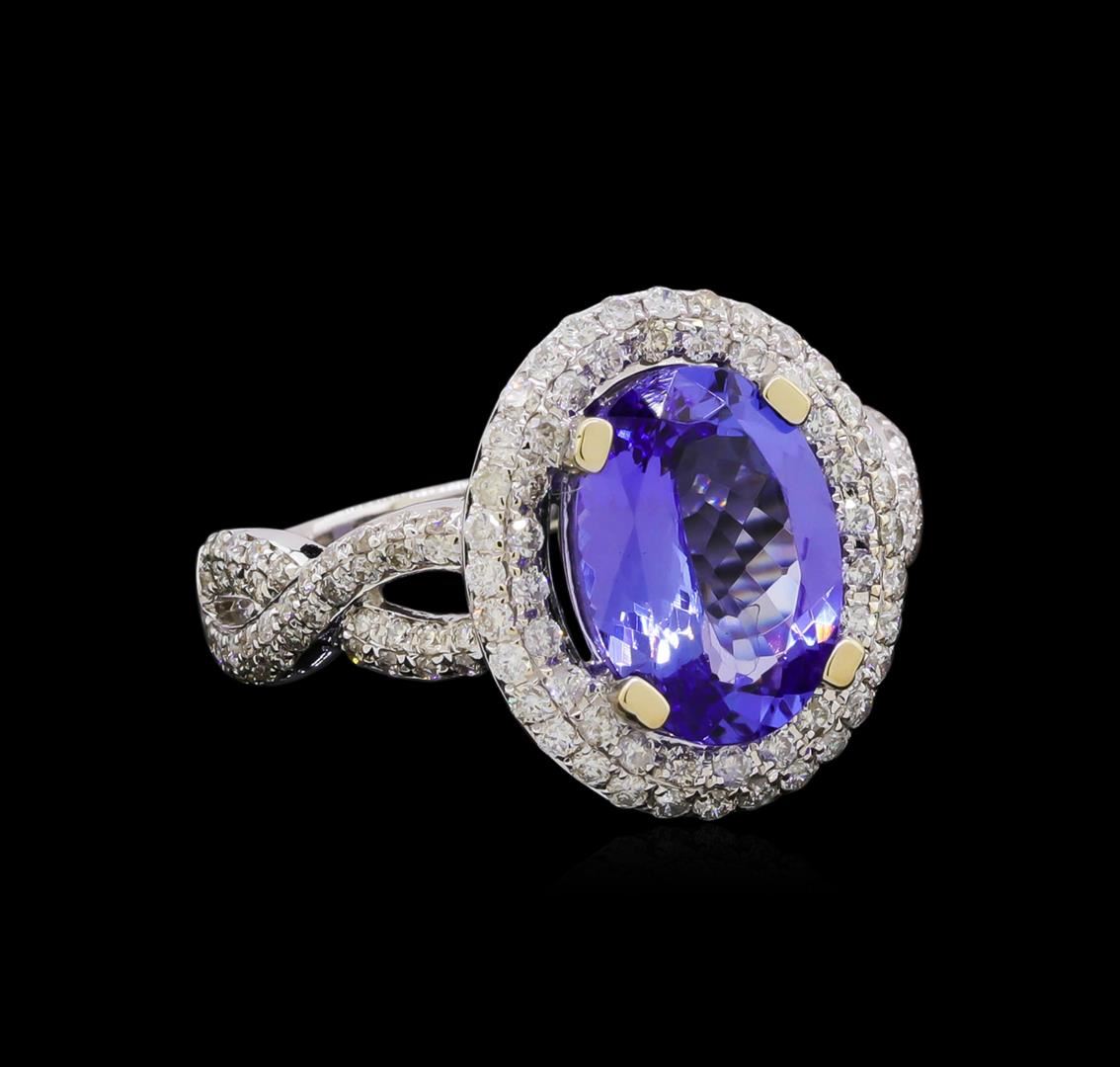 One electronically tested 14KT white gold ladies cast tanzanite and diamond ring with a bright polish finish. The featured tanzanite is set within a tiered diamond bezel supported by intertwining diamond set shoulders, completed by a two millimeter wide band. Trademark is UCG. Identified with markings of "14K 585". Condition is new, good workmanship. Containing: One prong set oval brilliant cut natural tanzanite, measuring 11.00 x 8.00 x 4.39mm, 6% bulge factor, approximate weight of 2.81ct., clarity is eye clean, type I, medium dark, very slightly grayish, bluish violet color, (GIA bV 6/3), cut is good. Transmitting light with no distortion, transparent. Graded in the setting. Tanzanite is a very rare gemstone that is only found in the country of Tanzania. Originally discovered in 1967. Tiffany & Company, named the stone Tanzanite. It is found in the Usumburu Mountains that border the Umba Valley of northern Tanzania. Tanzanite occurs in gray, brown, violet, blue, reddish-purple, & green. The gem is interesting because of its exceptional pleochroism. Rotated in different directions a tanzanite will exhibit multiple changes of color. Tanzanite has a low tolerance to ultrasonic cleaning, and should not be cleaned using this method. One Hundred Thirty-Four prong set round brilliant cut diamonds, measuring 1.20 - 1.00 x 0.66mm (depth est.) approximate total weight of 134 Stones = 0.74ct. Graded in the setting. Clarity: SI-2 to I-1. Color: G - I. Total Weight of Colored Stones 2.81ct. Total Weight of Diamonds 0.74ct. Total Weight of Ring 4.80 grams. AIG Appraised.