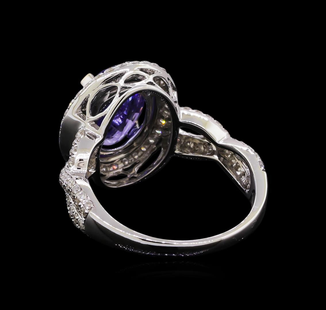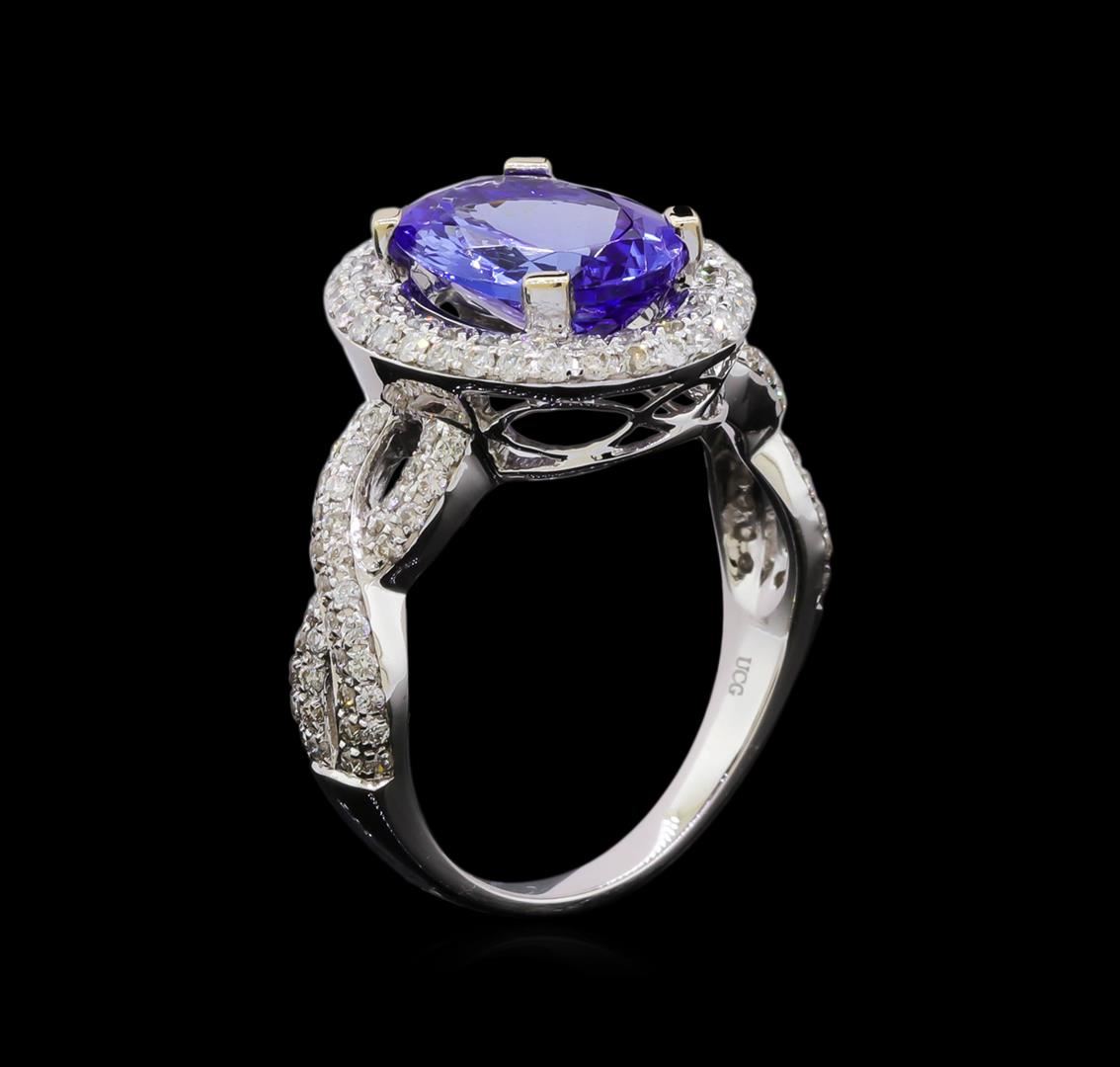 One electronically tested 14KT white gold ladies cast tanzanite and diamond ring with a bright polish finish. The featured tanzanite is set within a tiered diamond bezel supported by intertwining diamond set shoulders, completed by a two millimeter wide band. Trademark is UCG. Identified with markings of "14K 585". Condition is new, good workmanship. Containing: One prong set oval brilliant cut natural tanzanite, measuring 11.00 x 8.00 x 4.39mm, 6% bulge factor, approximate weight of 2.81ct., clarity is eye clean, type I, medium dark, very slightly grayish, bluish violet color, (GIA bV 6/3), cut is good. Transmitting light with no distortion, transparent. Graded in the setting. Tanzanite is a very rare gemstone that is only found in the country of Tanzania. Originally discovered in 1967. Tiffany & Company, named the stone Tanzanite. It is found in the Usumburu Mountains that border the Umba Valley of northern Tanzania. Tanzanite occurs in gray, brown, violet, blue, reddish-purple, & green. The gem is interesting because of its exceptional pleochroism. Rotated in different directions a tanzanite will exhibit multiple changes of color. Tanzanite has a low tolerance to ultrasonic cleaning, and should not be cleaned using this method. One Hundred Thirty-Four prong set round brilliant cut diamonds, measuring 1.20 - 1.00 x 0.66mm (depth est.) approximate total weight of 134 Stones = 0.74ct. Graded in the setting. Clarity: SI-2 to I-1. Color: G - I. Total Weight of Colored Stones 2.81ct. Total Weight of Diamonds 0.74ct. Total Weight of Ring 4.80 grams. AIG Appraised.