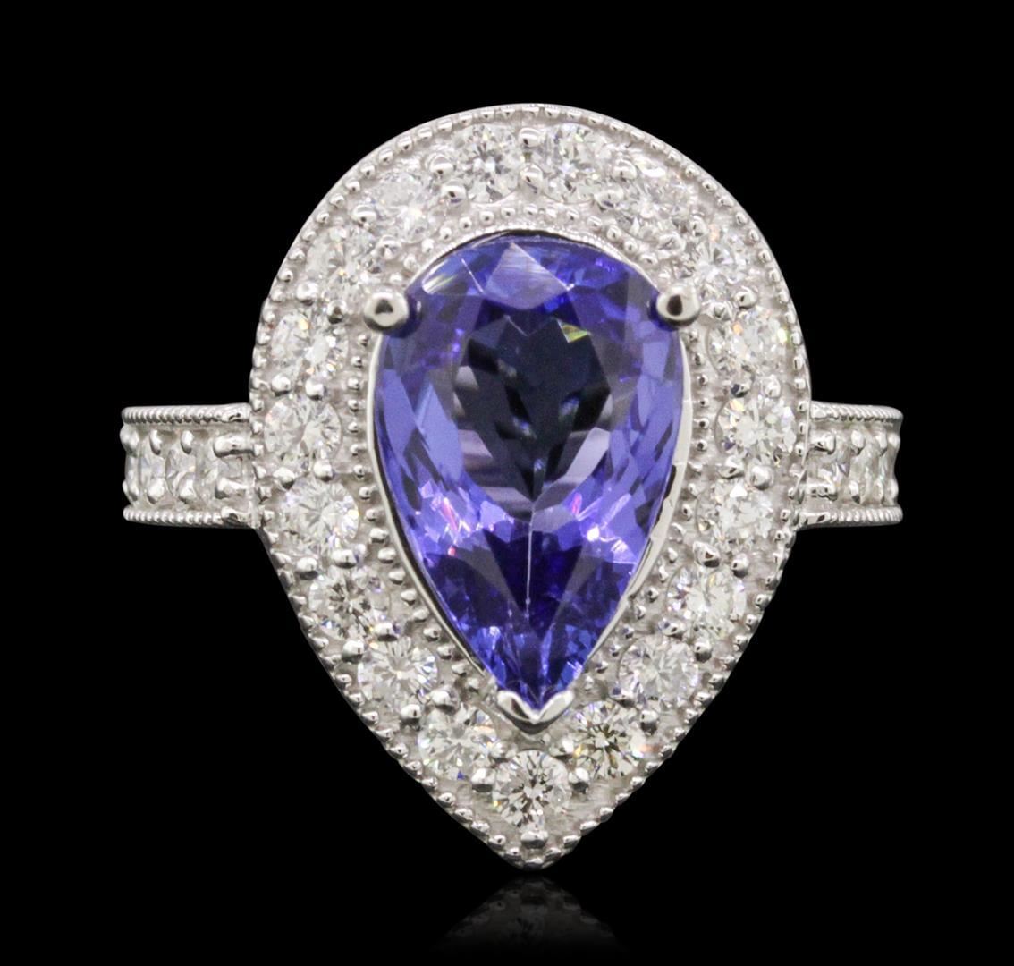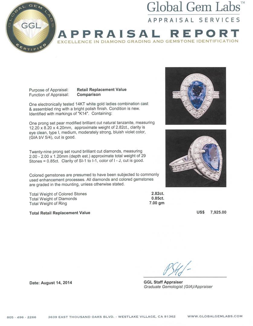 One electronically tested 14KT white gold ladies combination cast & assembled ring with a bright polish finish. Condition is new. Identified with markings of "K14". Containing: One prong set pear modified brilliant cut natural tanzanite, measuring 12.20 x 8.20 x 4.20mm, approximate weight of 2.82ct., clarity is eye clean, type I, medium, moderately strong, bluish violet color, (GIA bV 5/4), cut is good. Twenty-Nine prong set round brilliant cut diamonds, measuring 2.00 - 2.00 x 1.20mm (depth est.) approximate total weight of 29 Stones = 0.85ct. Clarity: SI-1 to I-1. Color: I - J, Cut is Good. Colored gemstones are presumed to have been subjected to commonly used enhancement processes. All diamonds and colored gemstones are graded in the mounting, unless otherwise stated. Total Weight of Colored Stones 2.82ct. Total Weight of Diamonds 0.85ct. Total Weight of Ring 7.00 grams. GGL Appraised.