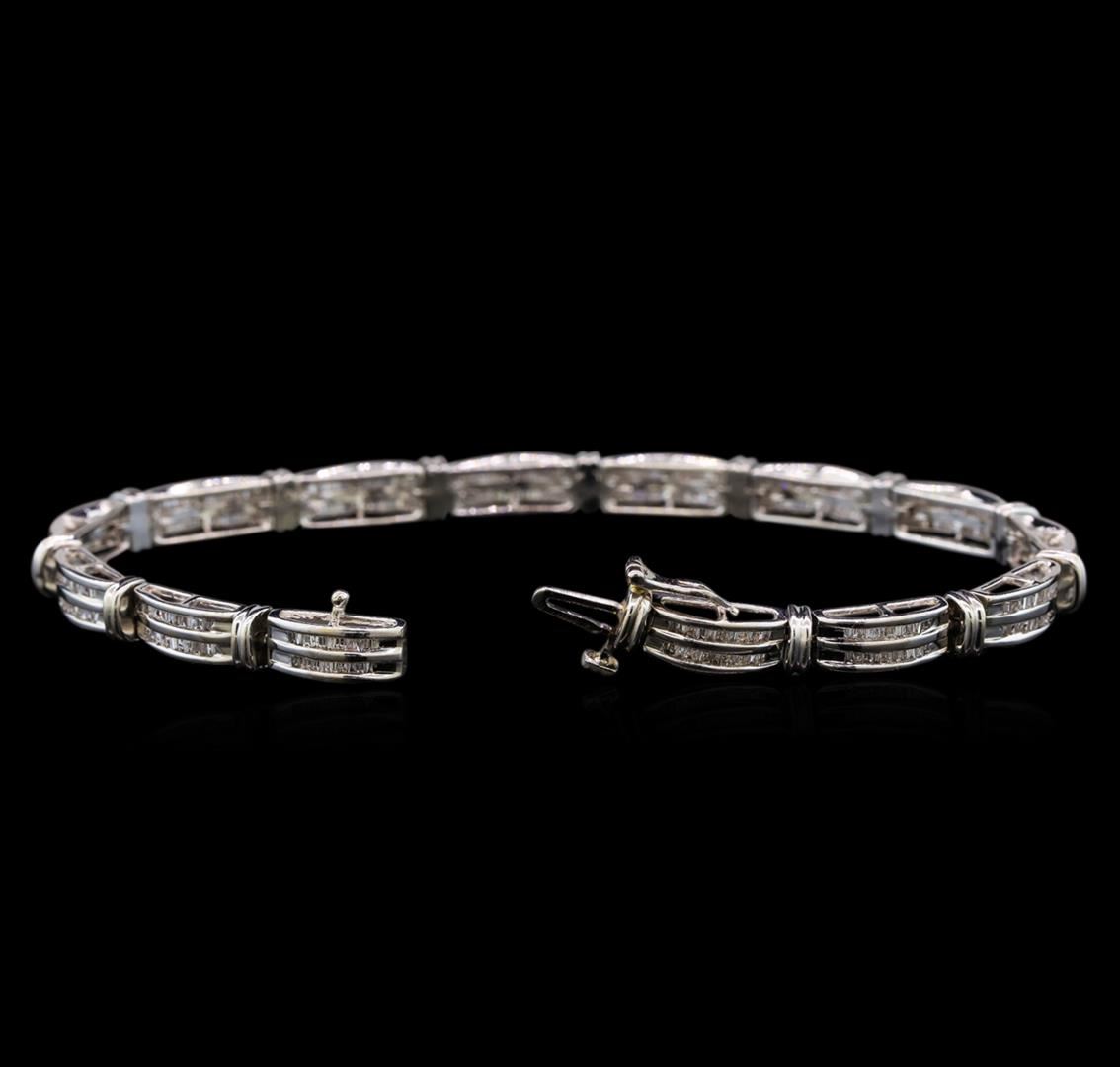 One electronically tested 14KT white gold ladies cast diamond bracelet with a hidden box clasp with safety closer with a bright polish finish. Measurements: 7 inches length Condition is very good. Containing: Two Hundred Eighty channel set baguette cut diamonds, measuring 1.30 x 1.00 x 0.85mm (depth est.) approximate total weight of 280 Stones = 2.83ct. Clarity: SI-2 to I-2. Color: I - J. All diamonds are graded in the mounting, unless otherwise stated. Total Weight of Diamonds 2.83ct. Total Weight of Bracelet 15.30 grams. GGL Appraised.