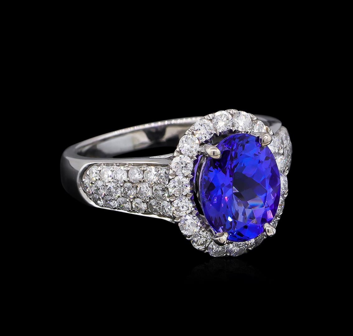 One electronically tested 14KT white gold Ladies combination cast & assembled ring with a bright polish finish. Condition is new. Identified with markings of "14K". Containing: Fifty-Four bead set round brilliant cut diamonds, measuring 1.70 - 1.70 x 1.02mm (depth est.) approximate. Total Weight of 54 Stones = 1.24ct. Clarity: I-1 to I-2. Color: H - I, Cut is Good. One prong set oval modified brilliant cut natural tanzanite, measuring 10.00 x 7.80 x 5.40mm, exact weight 2.88ct., clarity is eye clean, type I, medium light, very slightly grayish, violet color, (GIA V 4/3), cut is very good. Colored gemstones are presumed to have been subjected to commonly used color/clarity enhancement processes. Total Weight of Colored Stones 2.88ct. Total Weight of Diamonds 1.24ct. Total Weight of Ring 5.90 grams. GGL Appraised at $8,570.00.