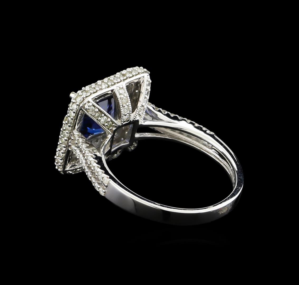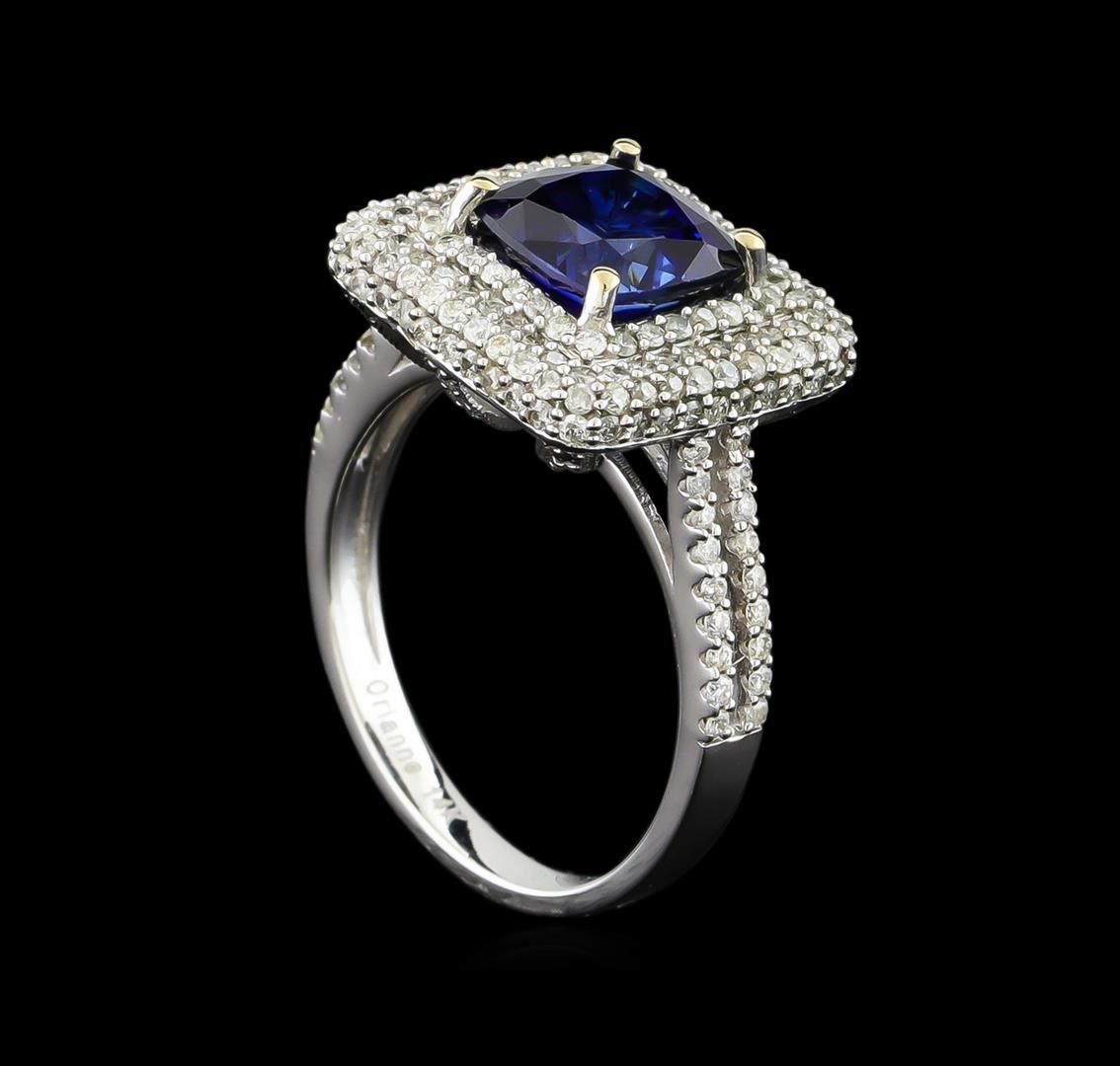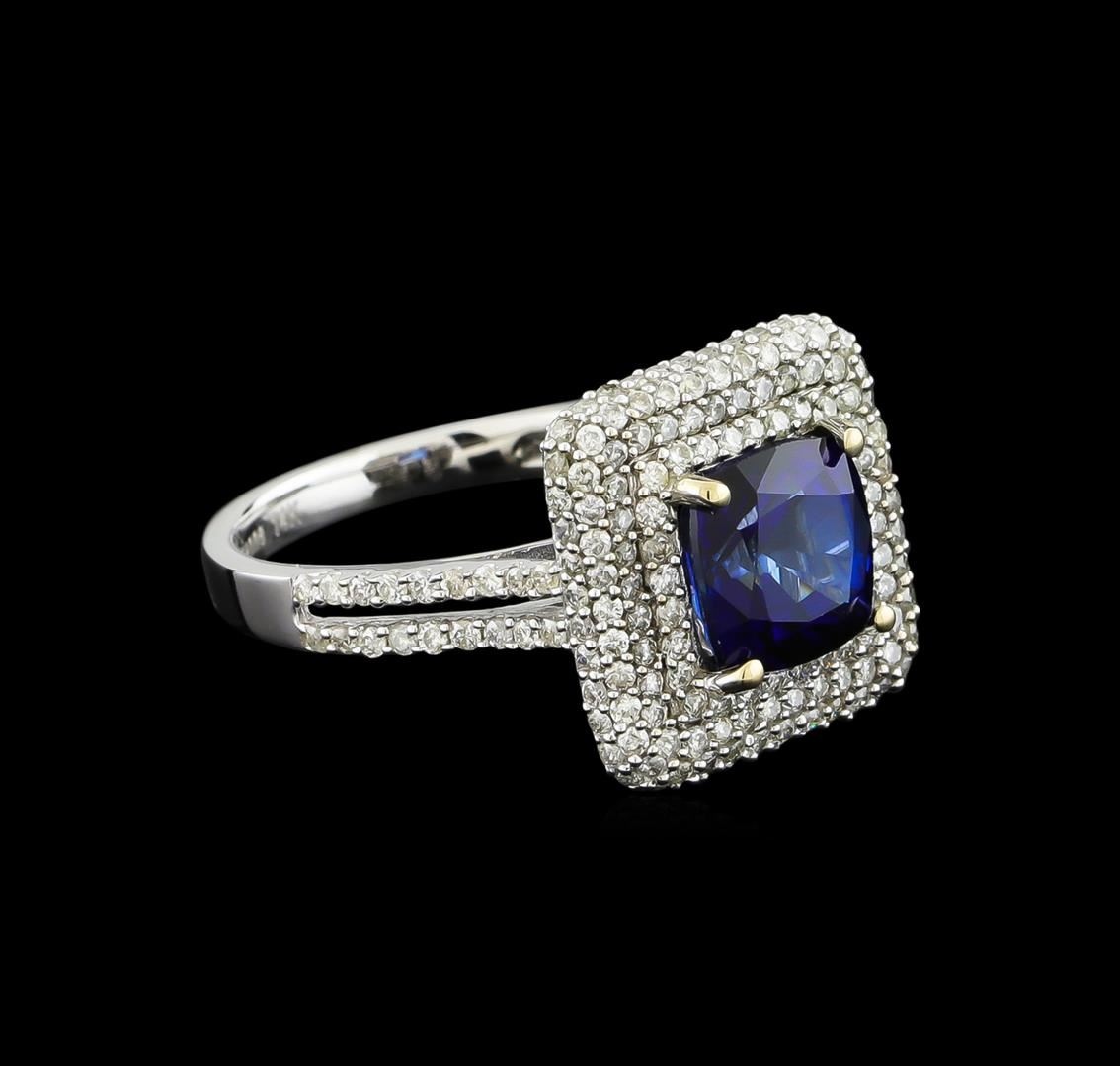 One electronically tested 14KT white gold ladies combination cast & assembled sapphire and diamond ring with a split shank with a bright polish finish. Identified with markings of "14K". Condition is new. Containing: One prong set square cushion modified brilliant cut natural blue sapphire, measuring 7.71 x 7.76 x 5.15mm, approximate weight of 2.90ct., clarity is eye clean, type II, medium dark, moderately strong, blue color, (GIA B 6/4), cut is very good. One Hundred Forty prong set round brilliant cut diamonds, measuring 1.10 - 1.10 x 0.66mm (depth est.) approximate total weight of 140 Stones = 0.67ct. Clarity: I-1 to I-2. Color: I - J, Cut is Good. Colored gemstones are presumed to have been subjected to commonly used enhancement processes. All diamonds and colored gemstones are graded in the mounting, unless otherwise stated. Total Weight of Colored Stones 2.90ct. Total Weight of Diamonds 0.67ct. Total Weight of Ring 5.10 grams. GGL Appraised.