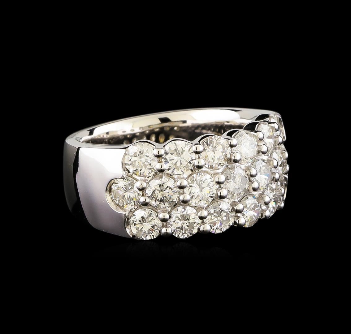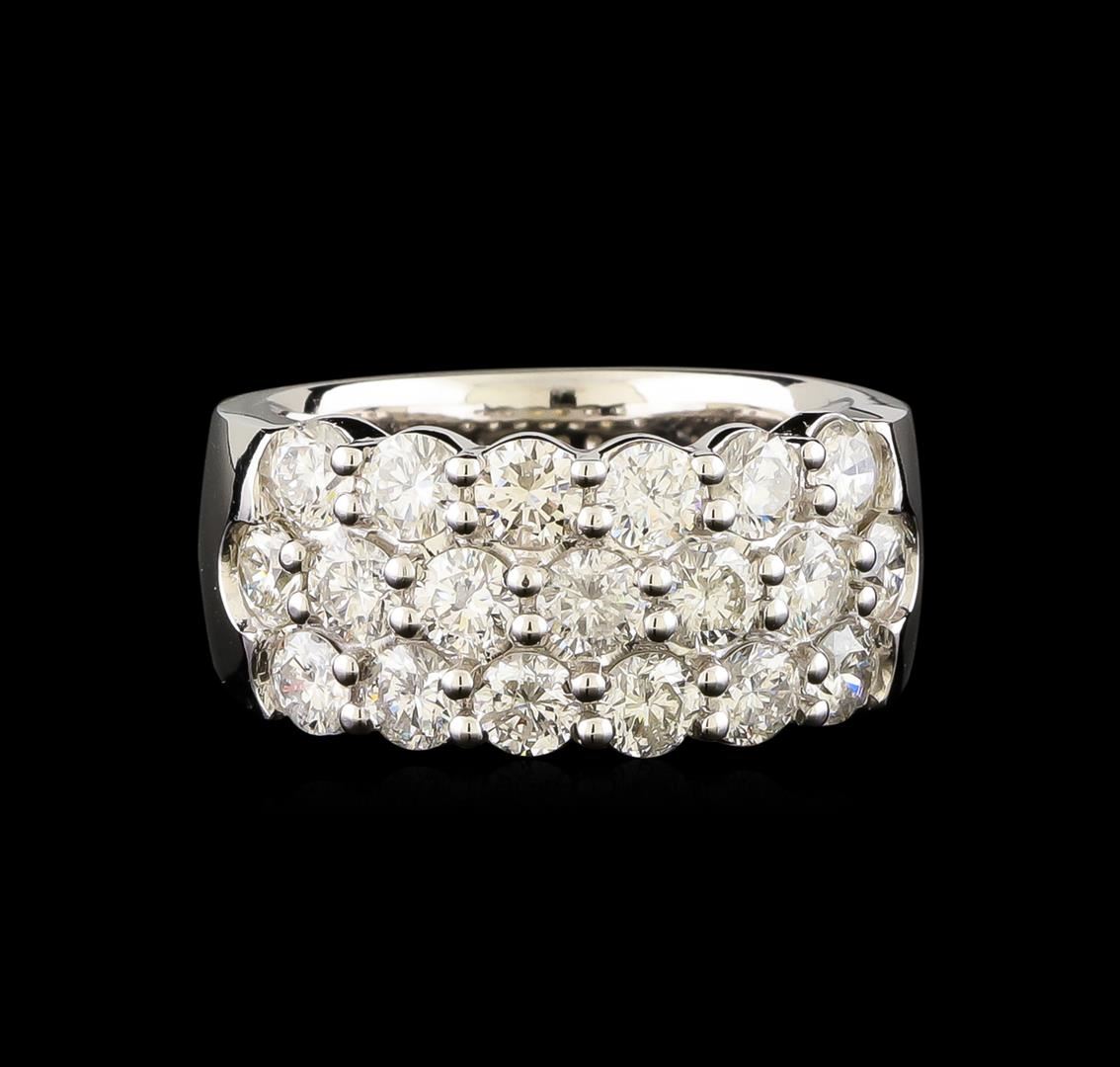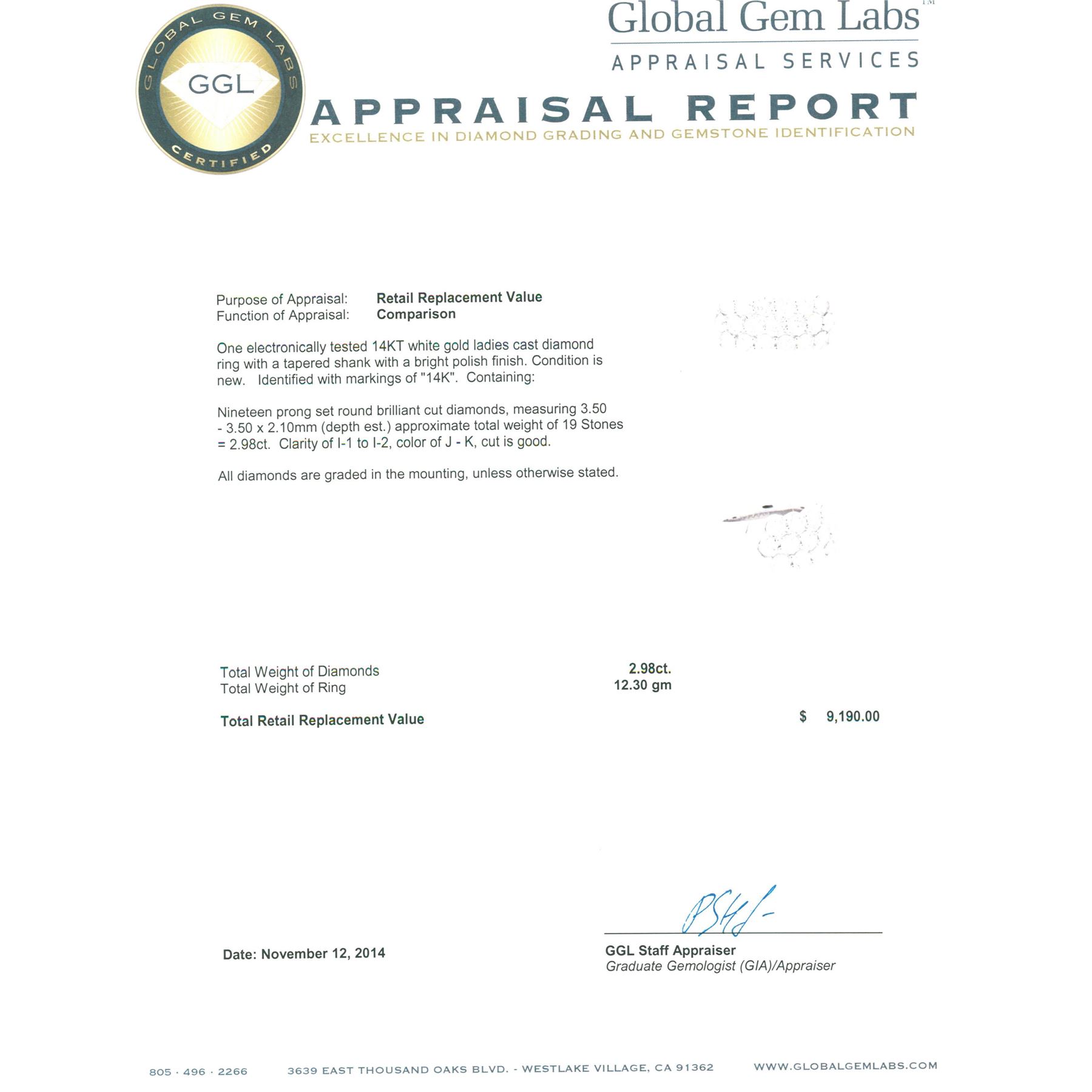 One electronically tested 14KT white gold ladies cast diamond ring with a tapered shank with a bright polish finish. Identified with markings of "14K". Condition is new. Containing: Nineteen prong set round brilliant cut diamonds, measuring 3.50 - 3.50 x 2.10mm (depth est.) approximate total weight of 19 Stones = 2.98ct. Clarity: I-1 to I-2. Color: J - K, Cut is Good. All diamonds are graded in the mounting, unless otherwise stated. Total Weight of Diamonds 2.98ct. Total Weight of Ring 12.30 grams. GGL Appraised.