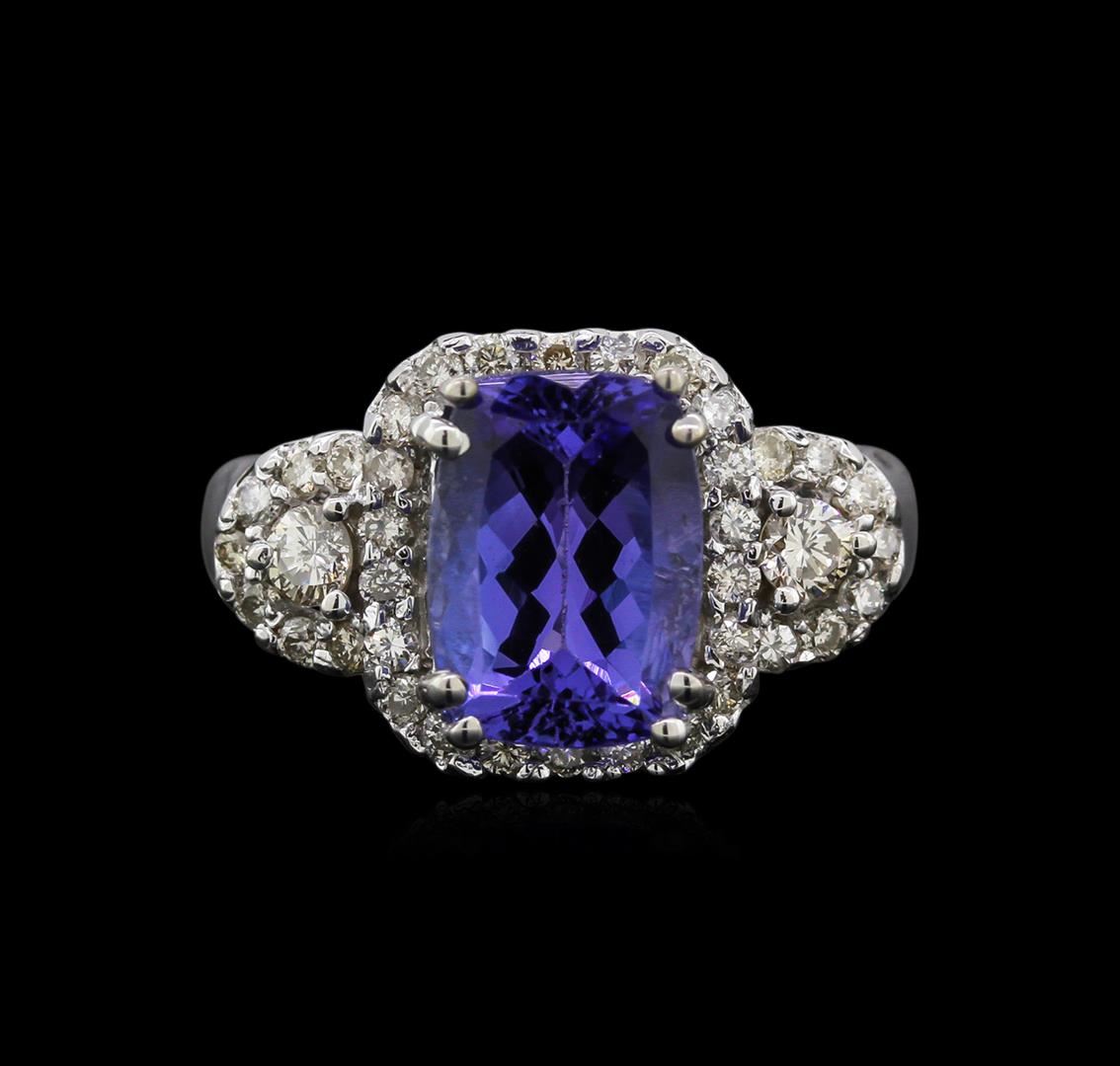 One electronically tested 14KT white gold ladies cast tanzanite and diamond ring with a tapered shank with a bright polish finish. Identified with markings of "14K". Condition is new. Containing: One prong set rectangular cushion modified brilliant cut natural tanzanite, measuring 9.95 x 7.29 x 5.21mm, approximate weight of 2.98ct., clarity is eye clean, type I, medium light, very slightly grayish, violet color, (GIA V 4/3), cut is good. Two prong set round brilliant cut diamonds, measuring 2.50 - 2.50 x 1.50mm (depth est.) approximate total weight of 2 Stones = 0.11ct. Clarity: SI-1 to SI-2. Color: J - K, Cut is Good. Thirty-Six prong set round brilliant cut diamonds, measuring 1.50 - 1.50 x 0.90mm (depth est.) approximate total weight of 36 Stones = 0.44ct. Clarity: SI-1 to I-1. Color: J - K, Cut is Good. Diamonds and colored gemstones are graded in the mounting, unless otherwise stated. Colored gemstones are presumed to have been subjected to commonly used enhancement processes. Total Weight of Colored Stones 2.98ct. Total Weight of Diamonds 0.56ct. Total Weight of Ring 6.10 grams. GGL Appraised at $4,060.00.