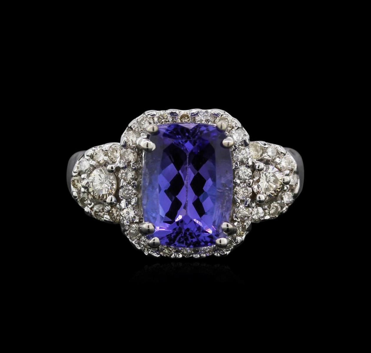 One electronically tested 14KT white gold ladies cast tanzanite and diamond ring with a tapered shank with a bright polish finish. Identified with markings of "14K". Condition is new. Containing: One prong set rectangular cushion modified brilliant cut natural tanzanite, measuring 9.95 x 7.29 x 5.21mm, approximate weight of 2.98ct., clarity is eye clean, type I, medium light, very slightly grayish, violet color, (GIA V 4/3), cut is good. Two prong set round brilliant cut diamonds, measuring 2.50 - 2.50 x 1.50mm (depth est.) approximate total weight of 2 Stones = 0.11ct. Clarity: SI-1 to SI-2. Color: J - K, Cut is Good. Thirty-Six prong set round brilliant cut diamonds, measuring 1.50 - 1.50 x 0.90mm (depth est.) approximate total weight of 36 Stones = 0.44ct. Clarity: SI-1 to I-1. Color: J - K, Cut is Good. Diamonds and colored gemstones are graded in the mounting, unless otherwise stated. Colored gemstones are presumed to have been subjected to commonly used enhancement processes. Total Weight of Colored Stones 2.98ct. Total Weight of Diamonds 0.56ct. Total Weight of Ring 6.10 grams. GGL Appraised.
