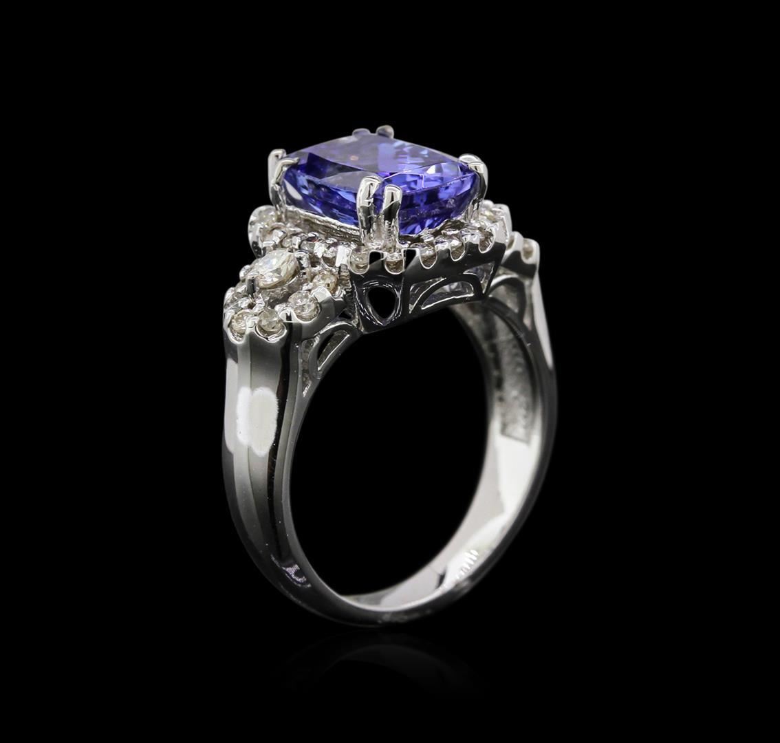 One electronically tested 14KT white gold ladies cast tanzanite and diamond ring with a tapered shank with a bright polish finish. Identified with markings of "14K". Condition is new. Containing: One prong set rectangular cushion modified brilliant cut natural tanzanite, measuring 9.95 x 7.29 x 5.21mm, approximate weight of 2.98ct., clarity is eye clean, type I, medium light, very slightly grayish, violet color, (GIA V 4/3), cut is good. Two prong set round brilliant cut diamonds, measuring 2.50 - 2.50 x 1.50mm (depth est.) approximate total weight of 2 Stones = 0.11ct. Clarity: SI-1 to SI-2. Color: J - K, Cut is Good. Thirty-Six prong set round brilliant cut diamonds, measuring 1.50 - 1.50 x 0.90mm (depth est.) approximate total weight of 36 Stones = 0.44ct. Clarity: SI-1 to I-1. Color: J - K, Cut is Good. Diamonds and colored gemstones are graded in the mounting, unless otherwise stated. Colored gemstones are presumed to have been subjected to commonly used enhancement processes. Total Weight of Colored Stones 2.98ct. Total Weight of Diamonds 0.56ct. Total Weight of Ring 6.10 grams. GGL Appraised.