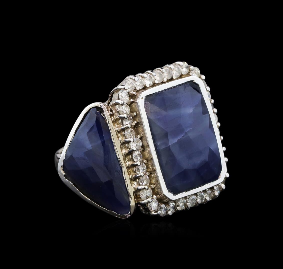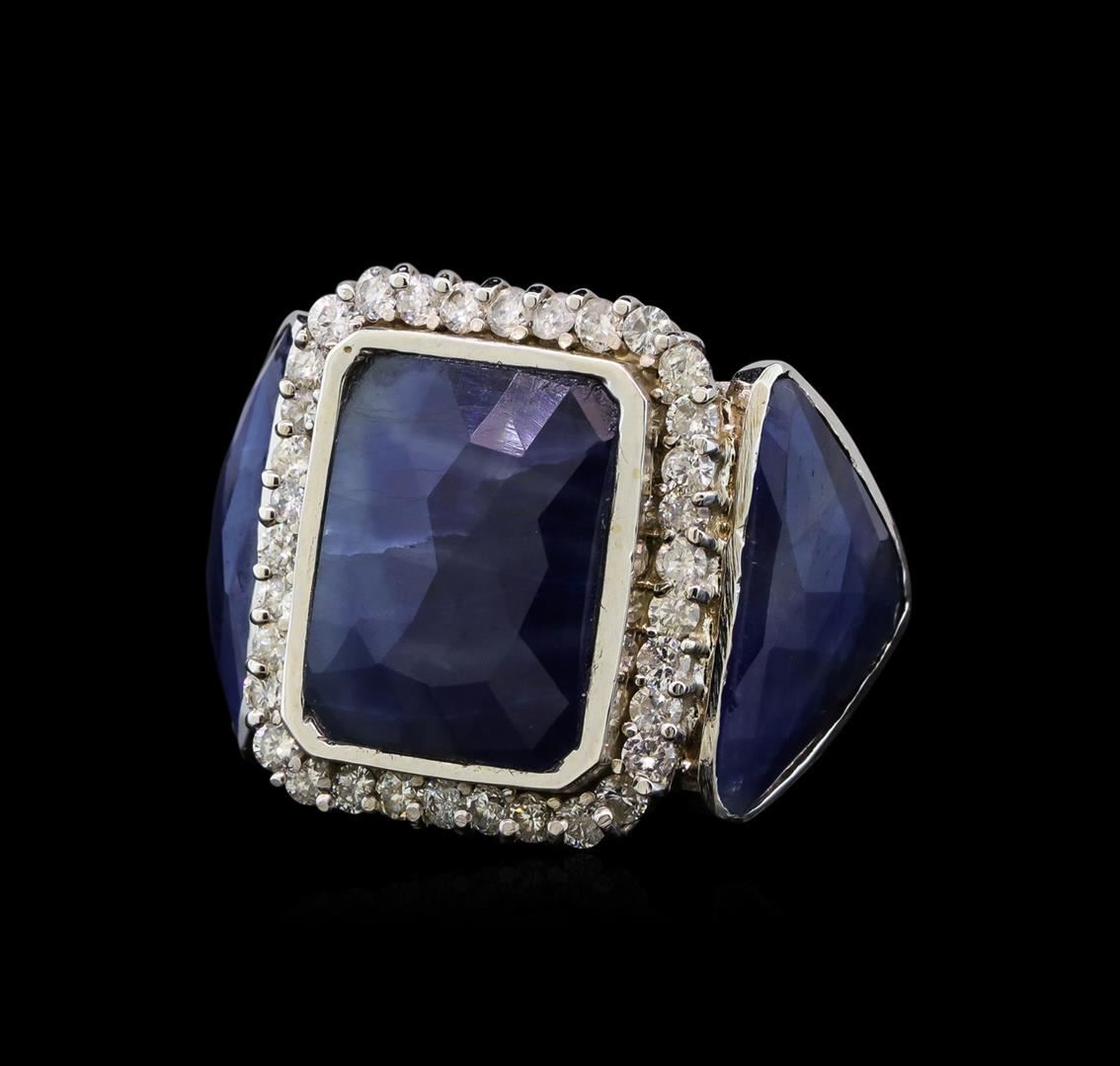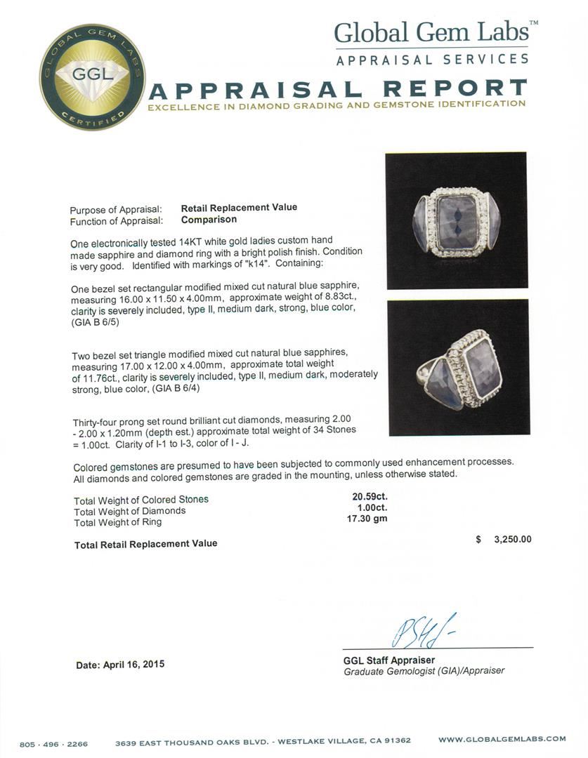 One electronically tested 14KT white gold ladies custom hand made sapphire and diamond ring with a bright polish finish. Identified with markings of "k14". Condition is very good. Containing: One bezel set rectangular modified mixed cut natural blue sapphire, measuring 16.00 x 11.50 x 4.00mm, approximate weight of 8.83ct., clarity is severely included, type II, medium dark, strong, blue color, (GIA B 6/5)Two bezel set triangle modified mixed cut natural blue sapphires, measuring 17.00 x 12.00 x 4.00mm, approximate total weight of 11.76ct., clarity is severely included, type II, medium dark, moderately strong, blue color, (GIA B 6/4)Thirty-Four prong set round brilliant cut diamonds, measuring 2.00 - 2.00 x 1.20mm (depth est.) approximate total weight of 34 Stones = 1.00 ct. Clarity: I-1 to I-3. Color: I - J. Colored gemstones are presumed to have been subjected to commonly used enhancement processes. All diamonds and colored gemstones are graded in the mounting, unless otherwise stated. Total Weight of Colored Stones 20.59ct. Total Weight of Diamonds 1.00 ct. Total Weight of Ring 17.30 grams. GGL Appraised.
