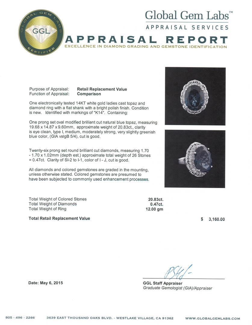 One electronically tested 14KT white gold ladies cast topaz and diamond ring with a flat shank with a bright polish finish. Identified with markings of "K14". Condition is new. Containing: One prong set oval modified brilliant cut natural blue topaz, measuring 19.68 x 14.87 x 9.60mm, approximate weight of 20.83ct., clarity is eye clean, type I, medium, moderately strong, very slightly greenish blue color, (GIA vslgB 5/4), cut is good. Twenty-Six prong set round brilliant cut diamonds, measuring 1.70 - 1.70 x 1.02mm (depth est.) approximate total weight of 26 Stones = 0.47ct. Clarity: SI-2 to I-1. Color: I - J, Cut is Good. All diamonds and colored gemstones are graded in the mounting, unless otherwise stated. Colored gemstones are presumed to have been subjected to commonly used enhancement processes.. Total Weight of Colored Stones 20.83ct. Total Weight of Diamonds 0.47ct. Total Weight of Ring 12.00 grams. GGL Appraised.