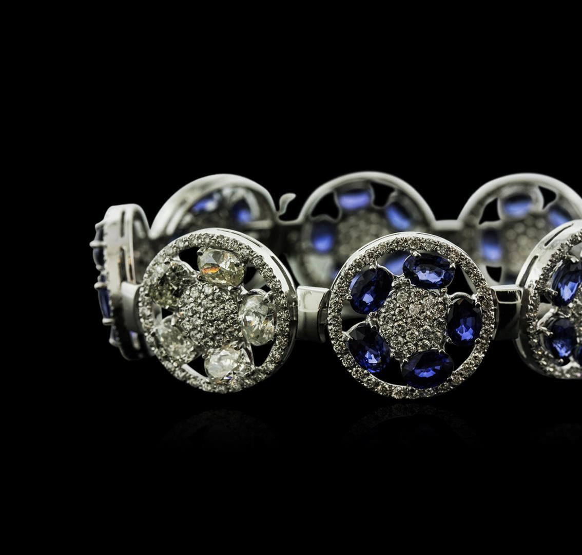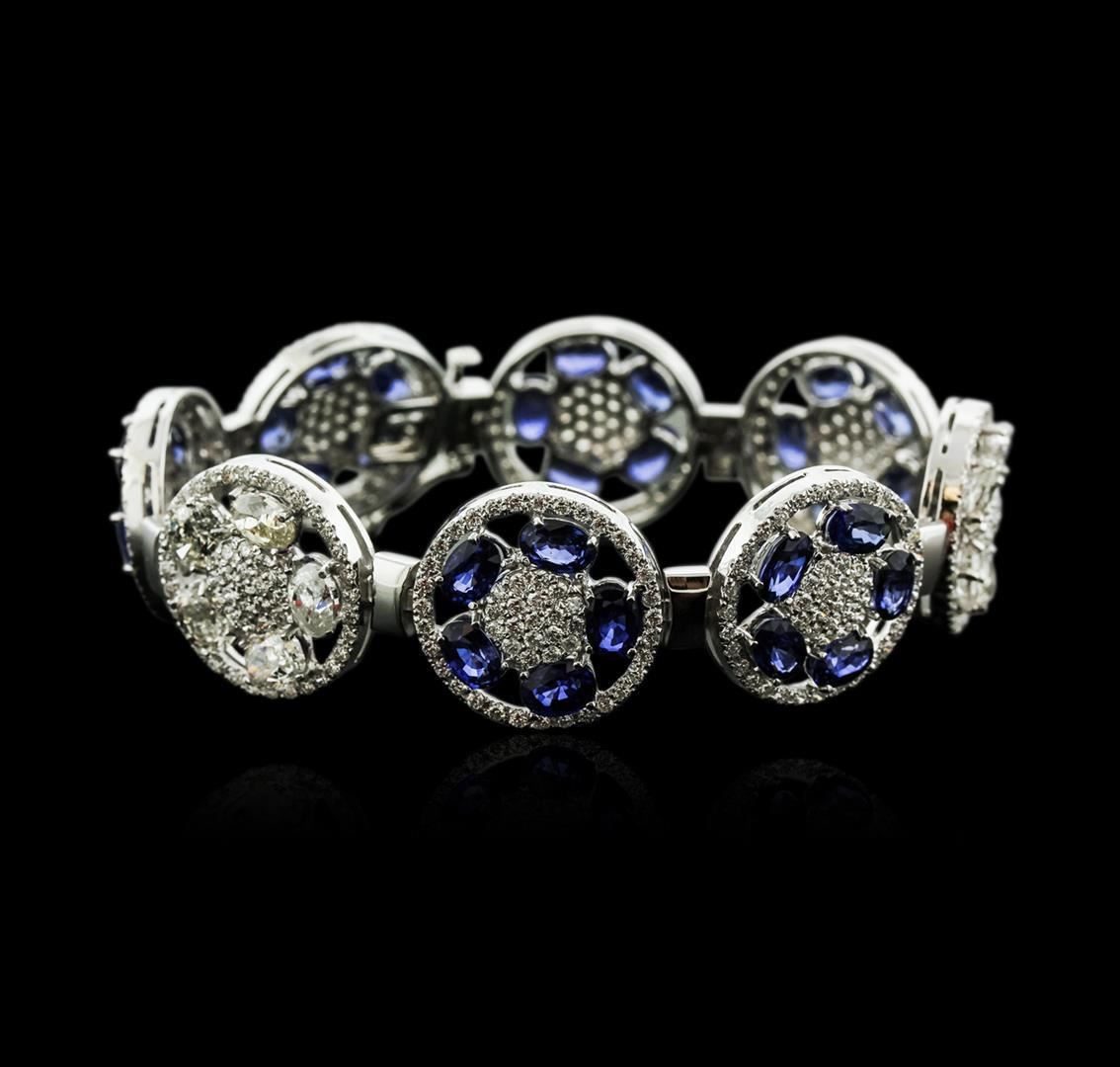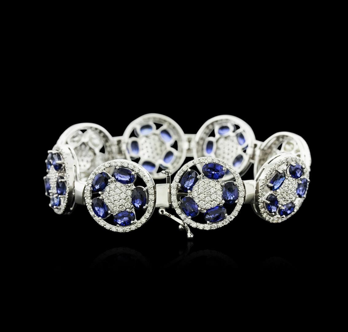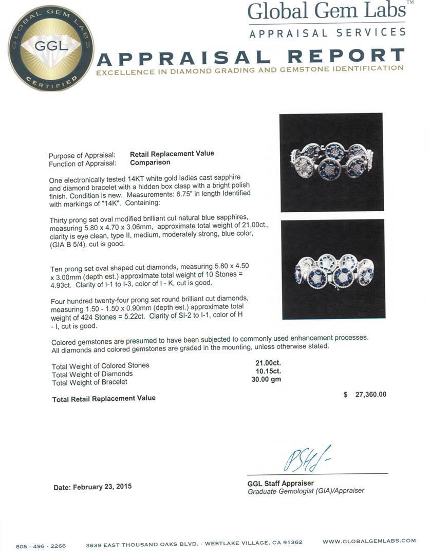 One electronically tested 14KT white gold ladies cast sapphire and diamond bracelet with a hidden box clasp with a bright polish finish. Measurements: 6.75" in length Identified with markings of "14K". Condition is new. Containing: Thirty prong set oval modified brilliant cut natural blue sapphires, measuring 5.80 x 4.70 x 3.06mm, approximate total weight of 21.00 ct., clarity is eye clean, type II, medium, moderately strong, blue color, (GIA B 5/4), cut is good. Ten prong set oval shaped cut diamonds, measuring 5.80 x 4.50 x 3.00mm (depth est.) approximate total weight of 10 Stones = 4.93ct. Clarity: I-1 to I-3. Color: I - K, Cut is Good. Four Hundred Twenty-Four prong set round brilliant cut diamonds, measuring 1.50 - 1.50 x 0.90mm (depth est.) approximate total weight of 424 Stones = 5.22ct. Clarity: SI-2 to I-1. Color: H - I, Cut is Good. Colored gemstones are presumed to have been subjected to commonly used enhancement processes. All diamonds and colored gemstones are graded in the mounting, unless otherwise stated. Total Weight of Colored Stones 21.00 ct. Total Weight of Diamonds 10.15ct. Total Weight of Bracelet 30.00 grams. GGL Appraised.