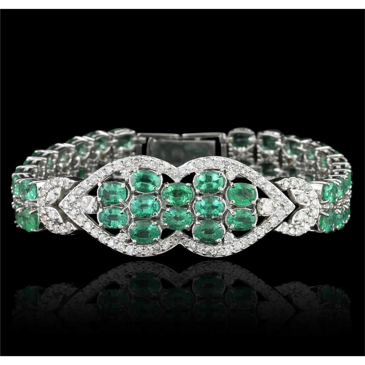 One electronically tested 14KT white gold ladies cast & assembled emerald and diamond bracelet with a bright polish finish. Condition is new, good workmanship. The seven inch length bracelet features an emerald and diamond ornament supported by a ribbon of emerald and diamonds, terminating in a fold over locking clasp. Identified with markings of "K14". Containing: Fifty prong set oval mixed cut natural emeralds, measuring 5.00 x 4.00 x 2.80mm, 8% bulge factor, approximate total weight of 22.00ct., clarity is heavily included, type III, medium, very slightly grayish, very slightly bluish green color, (GIA vslbG 5/3), cut is good. Transmitting light with a minimum of distortion, transparent. Naturally occurring internal & external characteristics are present. Indications of oil, & opticon residue. Measurements & the color grade are an average for the group. Graded in the setting. One hundred thirty-one prong set round brilliant cut diamonds, measuring 3.00 - 1.60 x 1.38mm (depth est.) approximate total weight of 131 Stones = 3.00ct. Graded in the setting. Clarity SI-1 to I- 1. Color F -- H. Total Weight of Colored Stones 22.00ct. Total Weight of Diamonds 3.00ct. Total Weight of Bracelet 27.80gm. AIG Appraised at $29,900.00.