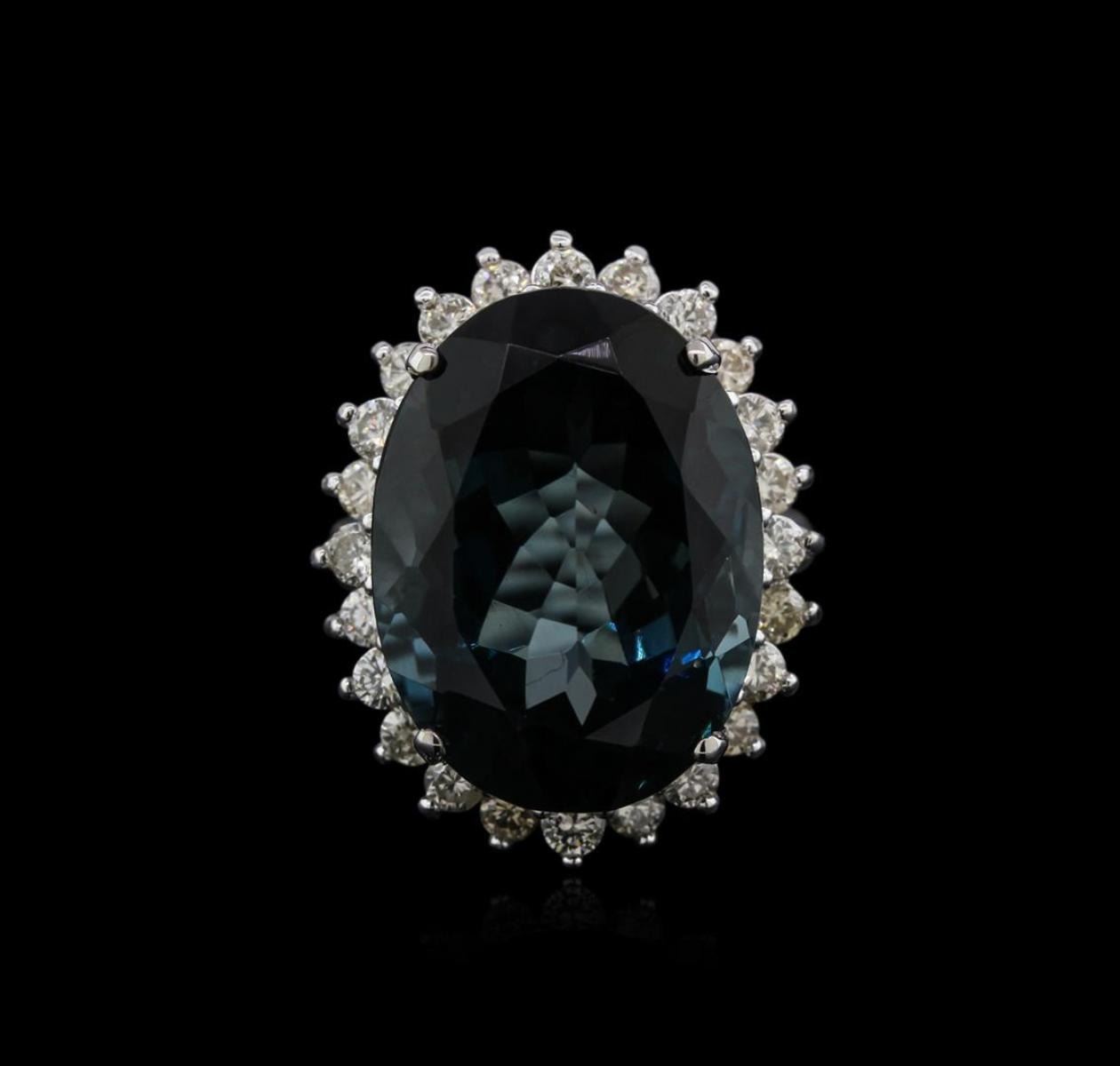 One electronically tested 14KT white gold ladies cast topaz and diamond ring with a cathedral shank with a bright polish finish. Identified with markings of "K14". Condition is new. Containing: One prong set oval modified brilliant cut natural blue topaz, measuring 20.00 x 14.83 x 10.20mm, approximate weight of 22.43ct., clarity is eye clean, type I, medium dark, moderately strong, greenish blue color, (GIA gB 6/4), cut is good. Twenty-Four prong set round brilliant cut diamonds, measuring 2.50 - 2.50 x 1.50mm (depth est.) approximate total weight of 24 Stones = 1.37ct. Clarity: I-1 to I-2. Color: K - L, Cut is Good. Diamonds and colored gemstones are graded in the mounting, unless otherwise stated. Colored gemstones are presumed to have been subjected to commonly used enhancement processes. Total Weight of Colored Stones 22.43ct. Total Weight of Diamonds 1.37ct. Total Weight of Ring 11.20 grams. GGL Appraised.