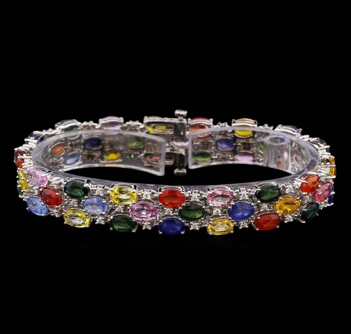 One stamped & tested 14KT white gold ladies cast sapphire and diamond bracelet with a hidden box clasp with a bright polish finish. Measurements: 7" in length Condition is new. Containing: Fifty-one prong set oval modified brilliant cut natural blue, green, pink and yellow sapphires, measuring 5.50 x 4.00. x 2.60mm, approximate total weight of 24.48ct., clarity is slightly included, type II, medium light, very slightly grayish, violet color, (GIA V 4/3), cut is good. Fifty-One prong set round brilliant cut diamonds, measuring 1.30 - 1.30 x 0.78mm (depth est.) approximate total weight of 51 Stones = 0.41ct. Clarity: SI-1 to SI-2. Color: I - J, Cut is Good. Colored gemstones are presumed to have been subjected to commonly used enhancement processes. All diamonds and colored gemstones are graded in the mounting, unless otherwise stated. Total Weight of Colored Stones 24.48ct. Total Weight of Diamonds 0.41ct. Total Weight of Bracelet 26.30 grams. GGL Appraised at $7,435.00.