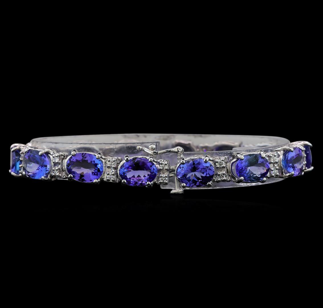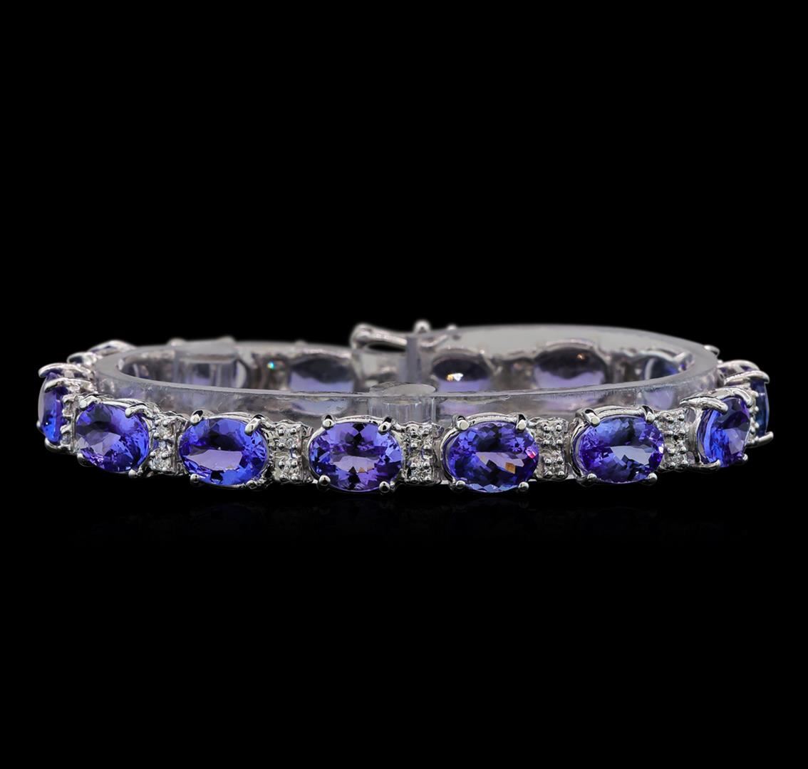 One electronically tested 14KT white gold ladies cast tanzanite and diamond bracelet with a hidden box clasp with safety closer with a bright polish finish. Measurements: 7" in length Identified with markings of "14K". Condition is new. Containing: Fourteen prong set oval modified brilliant cut natural tanzanites, measuring 9.00 x 7.00 x 4.55mm, approximate total weight of 25.66ct., clarity is eye clean, type I, medium light, very slightly grayish, violet color, (GIA V 4/3), cut is good. Twenty-Eight prong set round brilliant cut diamonds, measuring 2.00 - 2.00 x 1.20mm (depth est.) approximate total weight of 28 Stones = 0.80ct. Clarity: SI-1. Color: H - I, Cut is Good. Colored gemstones are presumed to have been subjected to commonly used enhancement processes. All diamonds and colored gemstones are graded in the mounting, unless otherwise stated. Total Weight of Colored Stones 25.66ct. Total Weight of Diamonds 0.80ct. Total Weight of Bracelet 20.40 grams. GGL Appraised at $12,360.00.