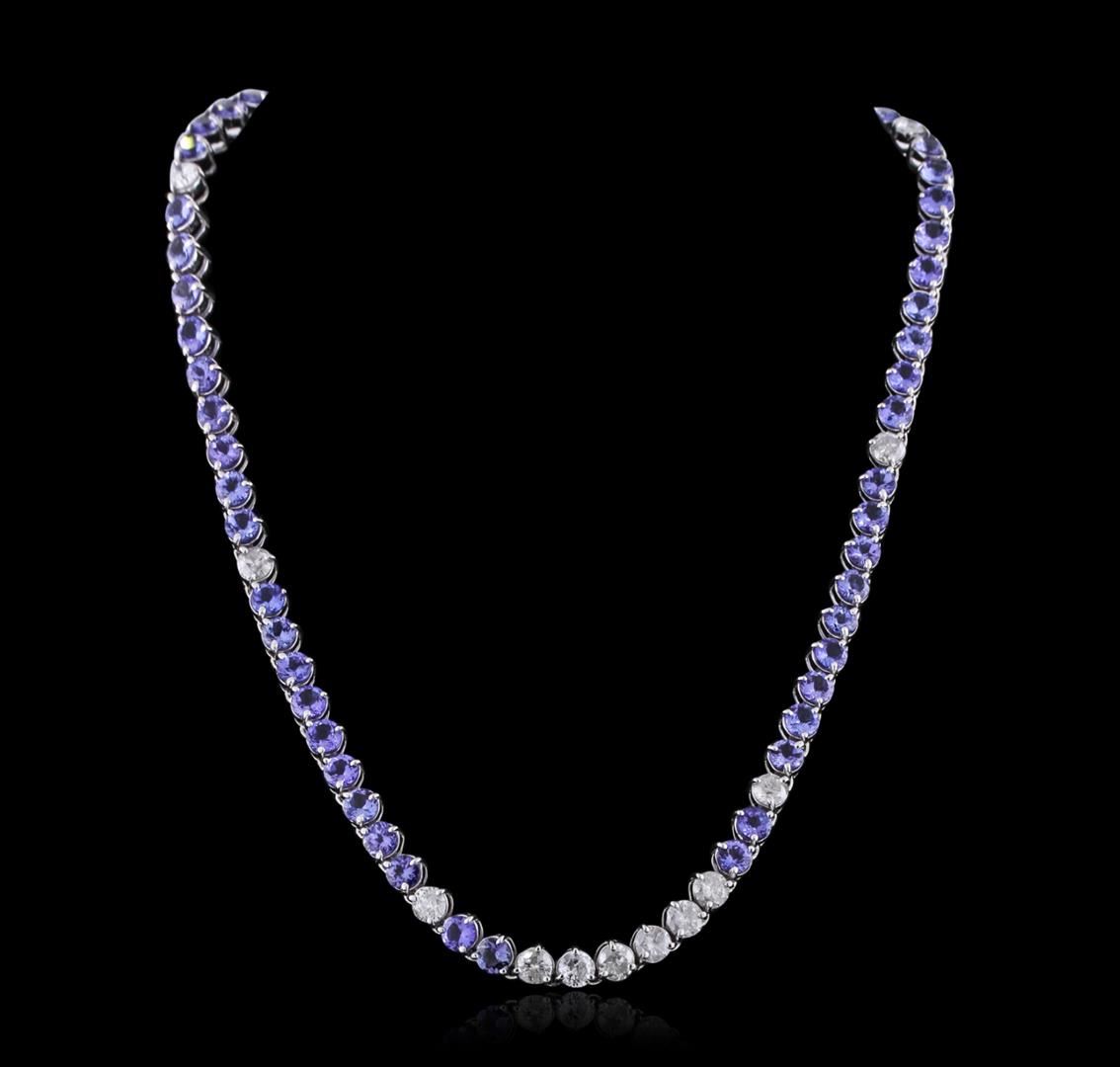 One electronically tested 14KT white gold Ladies combination cast & assembled necklace with a hidden box clasp with a bright polish finish. Condition is new. Measurements: 16.5" in length. Identified with markings of "14K". Containing: Fifty-eight prong set round modified brilliant cut natural tanzanites, measuring 4.80 - 4.80 x 3.12 mm, approximate. Total Weight of 27.84ct., clarity is eye clean, type I, medium light, very slightly grayish, bluish violet color, (GIA bV 4/3), cut is good. Twelve prong set round brilliant cut diamonds, measuring 5.30 - 5.30 x 3.18mm (depth est.) approximate. Total Weight of 12 Stones = 6.54ct. Clarity: I-2 to I-3. Color: I - J, Cut is Good. Colored gemstones are presumed to have been subjected to commonly used enhancement processes. All diamonds and colored gemstones are graded in the mounting, unless otherwise stated. Total Weight of Colored Stones 27.84ct. Total Weight of Diamonds 6.54ct. Total Weight of Necklace 38.20 grams. GGL Appraised at $48,300.00.