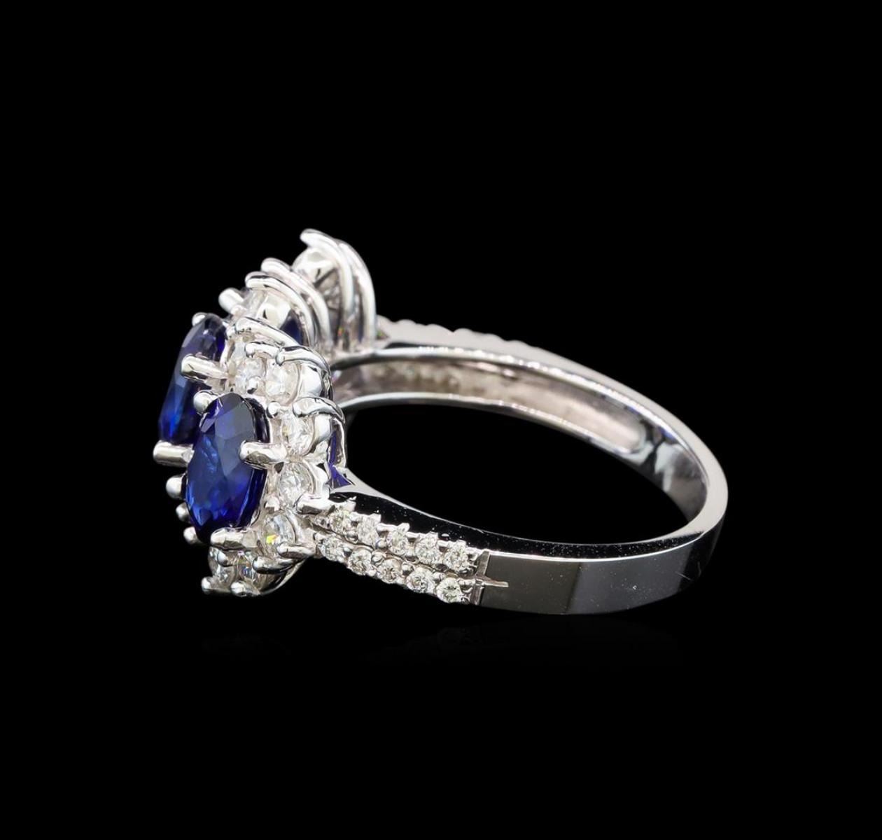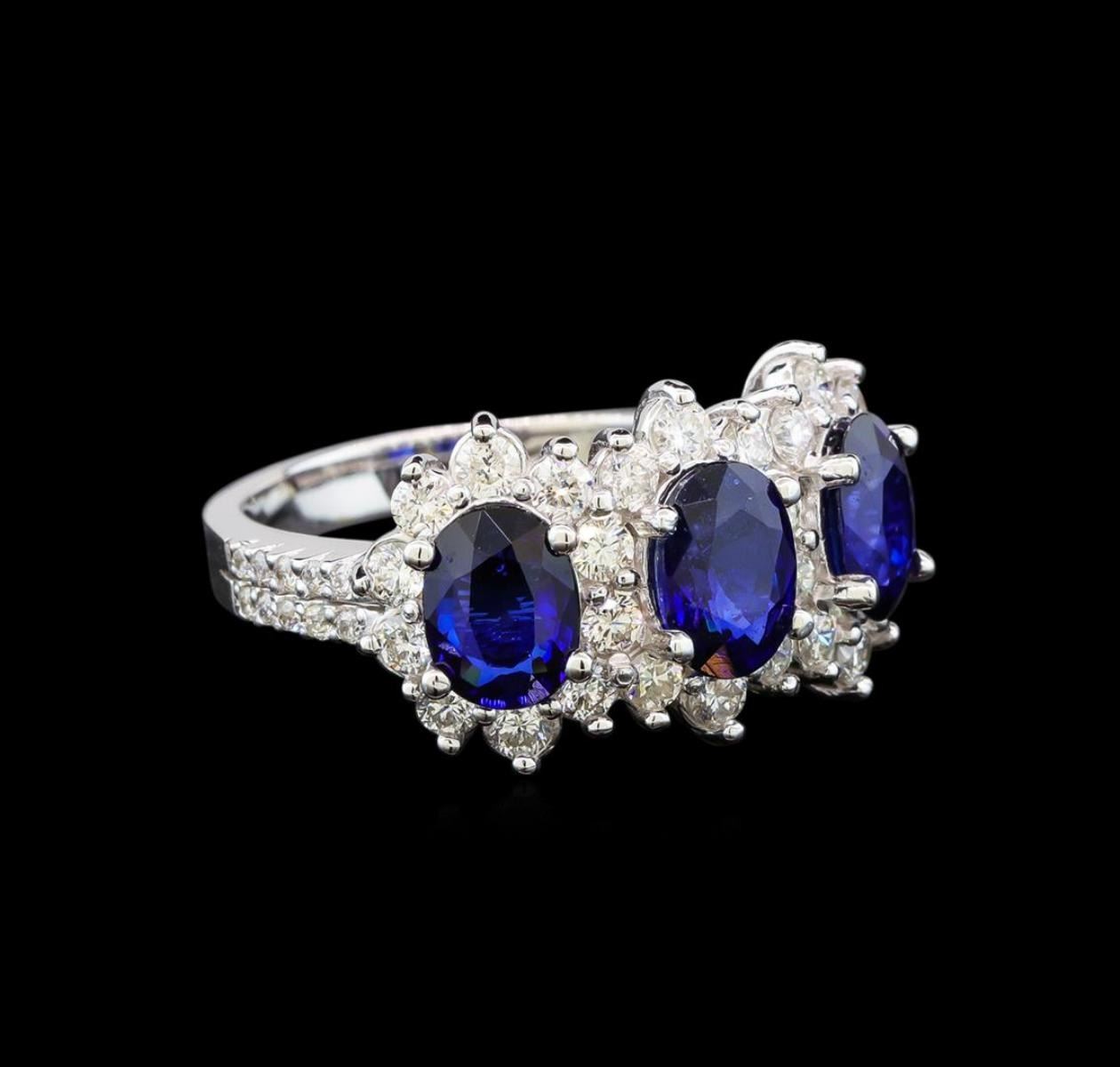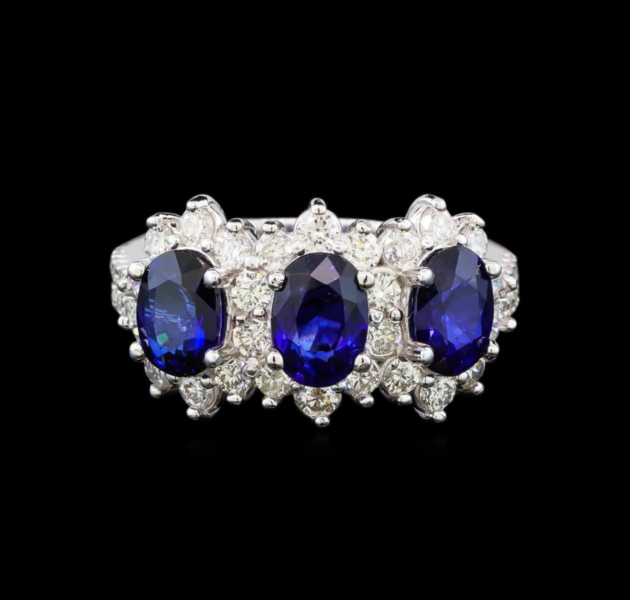 One electronically tested 14KT white gold ladies cast sapphire and diamond ring with a bright polish finish. Identified with markings of "K14". Condition is new. Containing: Three prong set oval modified brilliant cut natural blue sapphires, measuring 6.80 x 5.20 x 3.38mm, approximate total weight of 3.00ct., clarity is slightly included, type II, medium dark, moderately strong, blue color, (GIA B 6/4), cut is good. Twenty prong set round brilliant cut diamonds, measuring 1.00 - 1.00 x 0.60mm (depth est.) approximate total weight of 20 Stones = 0.07ct. Clarity: SI-2 to I-1. Color: H - I, Cut is Good. Twenty-Three prong set round brilliant cut diamonds, measuring 2.00 - 2.00 x 1.20mm (depth est.) approximate total weight of 23 Stones = 0.67ct. Clarity: SI-1 to SI-2. Color: I - J, Cut is Good. Colored gemstones are presumed to have been subjected to commonly used enhancement processes. All diamonds and colored gemstones are graded in the mounting, unless otherwise stated. Total Weight of Colored Stones 3.00ct. Total Weight of Diamonds 0.74ct. Total Weight of Ring 5.40 grams. GGL Appraised at $4,340.00.