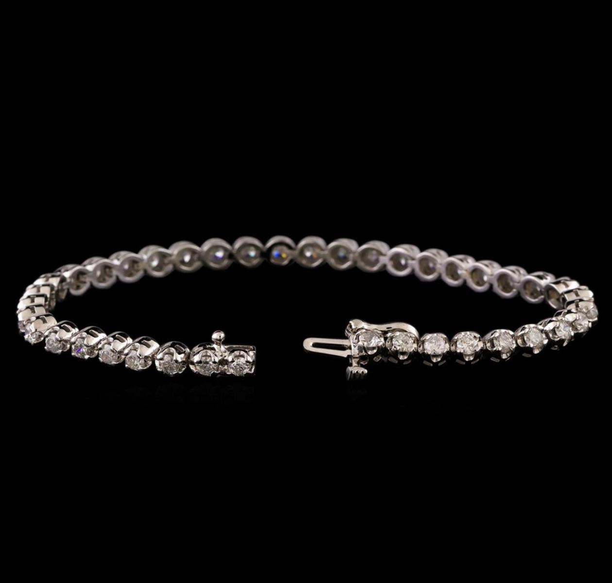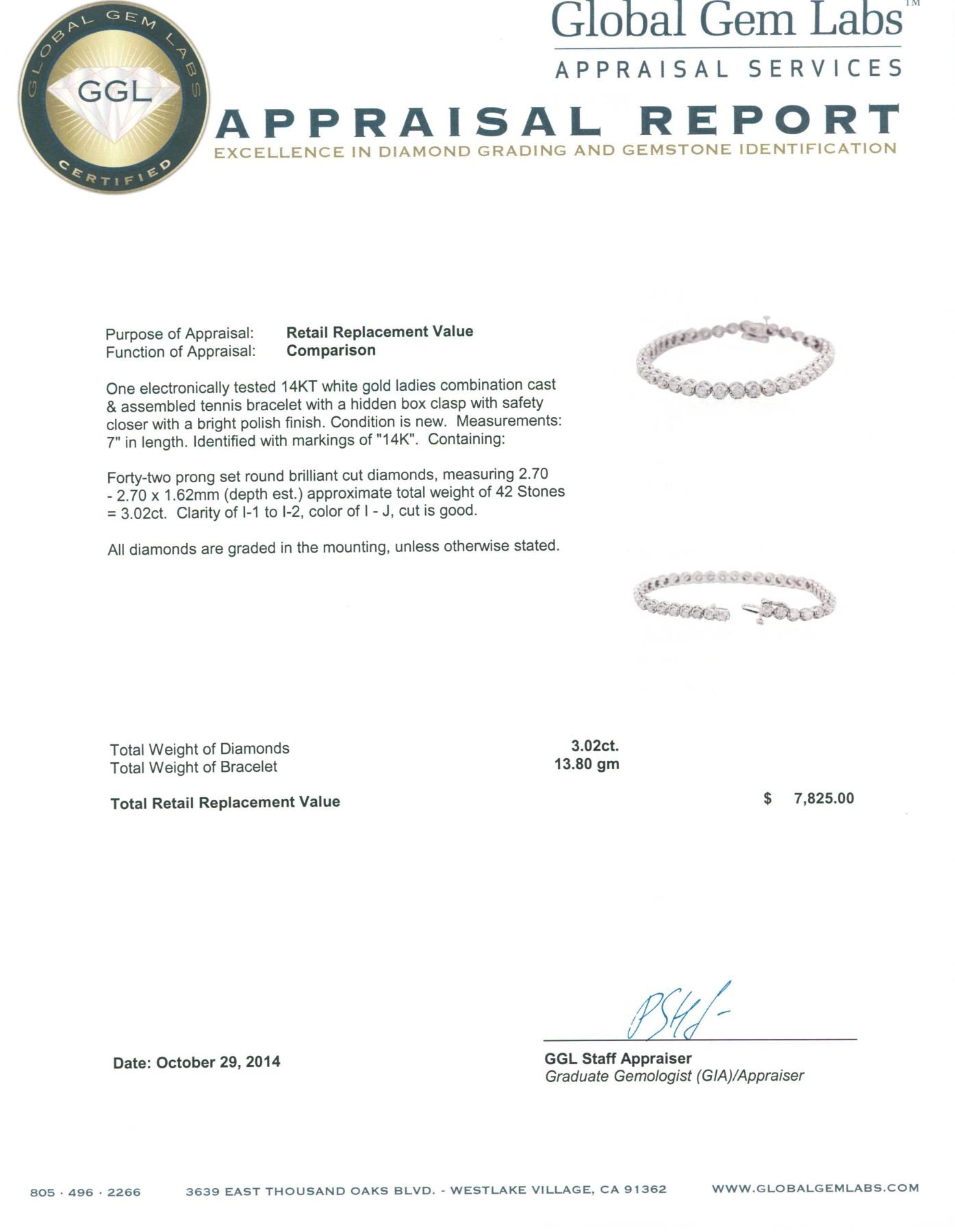 One electronically tested 14KT white gold ladies combination cast & assembled tennis bracelet with a hidden box clasp with safety closer with a bright polish finish. Measurements: 7 in length. Identified with markings of 14K. Condition is new. Containing: Forty-Two prong set round brilliant cut diamonds, measuring 2.70 - 2.70 x 1.62mm (depth est.) approximate total weight of 42 Stones = 3.02ct. Clarity: I-1 to I-2. Color: I - J, Cut is Good. All diamonds are graded in the mounting, unless otherwise stated. Total Weight of Diamonds 3.02ct. Total Weight of Bracelet 13.80 grams. GGL Appraised.