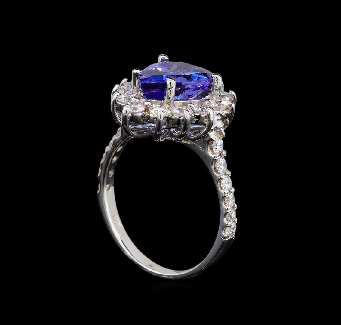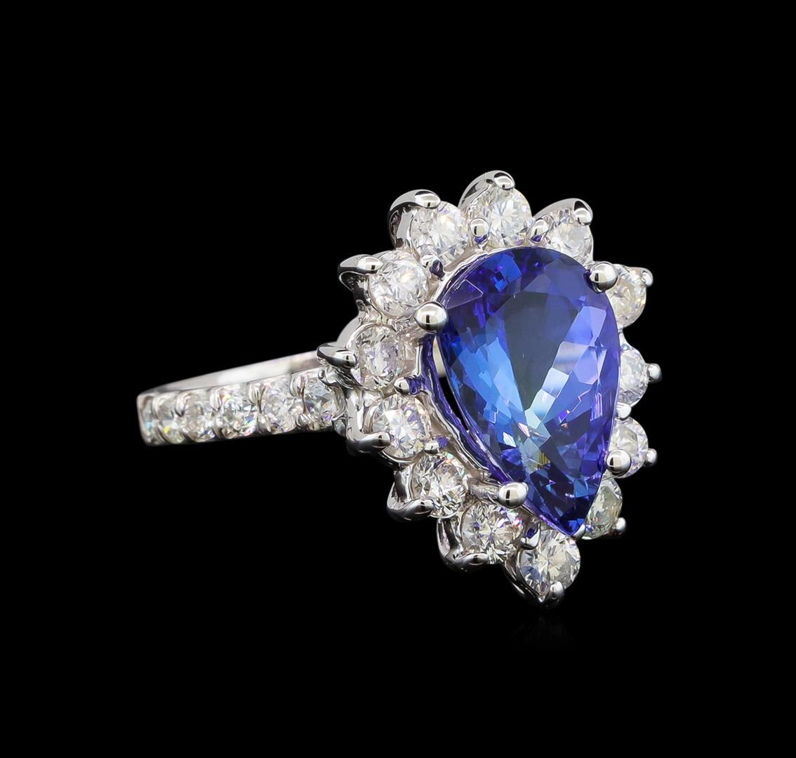 One electronically tested 14KT white gold ladies cast tanzanite and diamond ring with a half round shank with a bright polish finish. Identified with markings of "14K". Condition is new. Containing: One prong set pear modified brilliant cut natural tanzanite, measuring 11.50 x 7.80 x 5.07mm, approximate weight of 3.05ct., clarity is eye clean, type I, medium light, very slightly grayish, violet color, (GIA V 4/3), cut is good. Twenty-Eight prong set round brilliant cut diamonds, measuring 2.50 - 2.00 x 1.35mm (depth est.) approximate total weight of 28 Stones = 1.00ct. Clarity: SI-2 to I-1. Color: I - J. All diamonds and colored gemstones are graded in the mounting, unless otherwise stated. Colored gemstones are presumed to have been subjected to commonly used enhancement processes. Total Weight of Colored Stones 3.05ct. Total Weight of Diamonds 1.00ct. Total Weight of Ring 4.80 grams. GGL Appraised at $5,775.00.