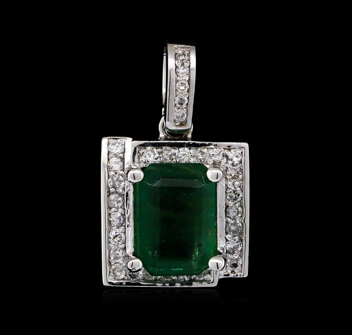One electronically tested 14KT white gold ladies cast & assembled emerald and diamond pendant with a bright polish finish. Condition is new, good workmanship. The featured emerald is set within a stylized diamond bezel, completed by a diamond set bail. Identified with markings of "14K". Containing: One prong set rectangular step cut natural emerald, measuring 9.95 x 7.10 x 5.00mm, 6% bulge factor, approximate weight of 3.06ct., clarity is heavily included, type III, medium dark, very slightly grayish, very slightly bluish green color, (GIA vslbG 6/3), cut is good. Transmitting light with a minimum of distortion, transparent. Naturally occurring internal & external characteristics are present. Indications of oil residue. graded in the setting. Thirty bead set round brilliant cut diamonds, measuring 1.50 - 1.40 x 0.87mm (depth est.) approximate total weight of 30 Stones = 0.43ct. Graded in the setting. Clarity SI-1 to I-1 Color H - J Total Weight of Colored Stones 3.06ct. Total Weight of Diamonds 0.43ct. Total Weight of Pendant 3.97 grams. AIG appraised at $4,710.00. AIG Appraised at $4,710.00.