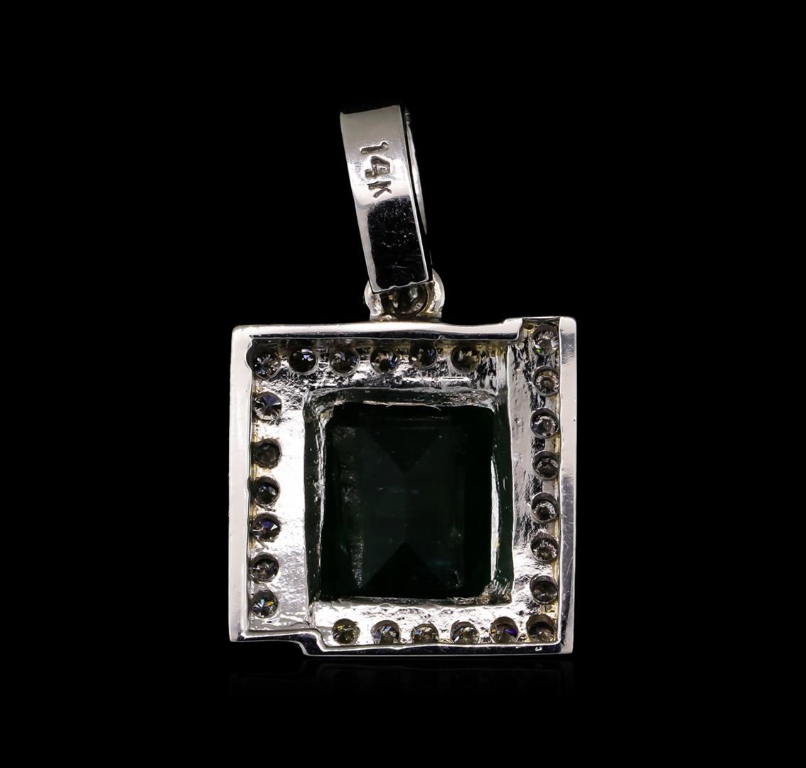 One electronically tested 14KT white gold ladies cast & assembled emerald and diamond pendant with a bright polish finish. Condition is new, good workmanship. The featured emerald is set within a stylized diamond bezel, completed by a diamond set bail. Identified with markings of "14K". Containing: One prong set rectangular step cut natural emerald, measuring 9.95 x 7.10 x 5.00mm, 6% bulge factor, approximate weight of 3.06ct., clarity is heavily included, type III, medium dark, very slightly grayish, very slightly bluish green color, (GIA vslbG 6/3), cut is good. Transmitting light with a minimum of distortion, transparent. Naturally occurring internal & external characteristics are present. Indications of oil residue. graded in the setting. Thirty bead set round brilliant cut diamonds, measuring 1.50 - 1.40 x 0.87mm (depth est.) approximate total weight of 30 Stones = 0.43ct. Graded in the setting. Clarity SI-1 to I-1 Color H - J Total Weight of Colored Stones 3.06ct. Total Weight of Diamonds 0.43ct. Total Weight of Pendant 3.97 grams. AIG appraised at $4,710.00. AIG Appraised at $4,710.00.
