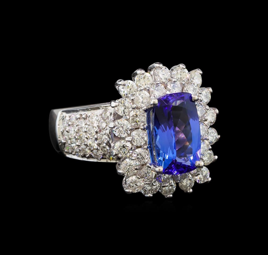 One electronically tested 14KT white gold ladies cast tanzanite and diamond ring with a bright polish finish. Identified with markings of "14K". Condition is new. Containing: One prong set rectangular cushion modified brilliant cut natural tanzanite, measuring 11.30 x 7.27 x 4.73mm, approximate weight of 3.06ct., clarity is eye clean, type I, medium light, very slightly grayish, violet color, (GIA V 4/3), cut is good. Fifty-Five prong set round brilliant cut diamonds, measuring 2.50 - 1.50 x 1.20mm (depth est.) approximate total weight of 55 Stones = 1.61ct. Clarity: SI-1 to I-1. Color: H - I, Cut is Good. Colored gemstones are presumed to have been subjected to commonly used enhancement processes. All diamonds and colored gemstones are graded in the mounting, unless otherwise stated. Total Weight of Colored Stones 3.06ct. Total Weight of Diamonds 1.61ct. Total Weight of Ring 8.00. grams. GGL Appraised.