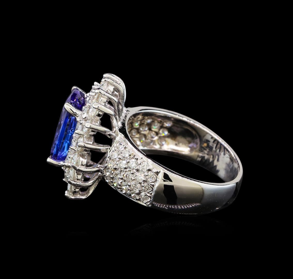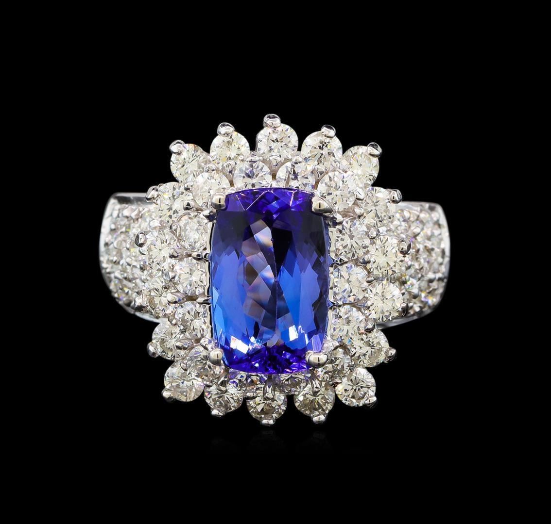 One electronically tested 14KT white gold ladies cast tanzanite and diamond ring with a bright polish finish. Identified with markings of "14K". Condition is new. Containing: One prong set rectangular cushion modified brilliant cut natural tanzanite, measuring 11.30 x 7.27 x 4.73mm, approximate weight of 3.06ct., clarity is eye clean, type I, medium light, very slightly grayish, violet color, (GIA V 4/3), cut is good. Fifty-Five prong set round brilliant cut diamonds, measuring 2.50 - 1.50 x 1.20mm (depth est.) approximate total weight of 55 Stones = 1.61ct. Clarity: SI-1 to I-1. Color: H - I, Cut is Good. Colored gemstones are presumed to have been subjected to commonly used enhancement processes. All diamonds and colored gemstones are graded in the mounting, unless otherwise stated. Total Weight of Colored Stones 3.06ct. Total Weight of Diamonds 1.61ct. Total Weight of Ring 8.00. grams. GGL Appraised.