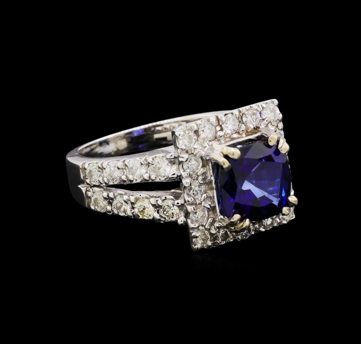 One electronically tested 14KT white gold ladies cast sapphire and diamond ring with a bright polish finish. The featured sapphire is set within a diamond bezel supported by diamond set split shoulders, completed by a two and one-half millimeter wide band. Identified with markings of "K14". Condition is new, good workmanship. Containing: One prong set square cushion brilliant cut natural blue sapphire, measuring 7.85 x 7.75 x 5.08mm, 6% bulge factor, approximate weight of 3.08ct., clarity is eye clean, type II, dark, very slightly grayish, blue color, (GIA B 7/3), cut is good. Transmitting light with no distortion, transparent. Indications of laboratory high temperature diffusion treatment. Graded in the setting. Thirty-Two prong set round brilliant cut diamonds, measuring 2.10 - 2.00 x 1.23mm (depth est.) approximate total weight of 32 Stones = 1.10 ct. Graded in the setting. Clarity: SI-2 to I-2. Color: G - I. Total Weight of Colored Stones 3.08ct. Total Weight of Diamonds 1.10 ct. Total Weight of Ring 7.33 grams. AIG Appraised.