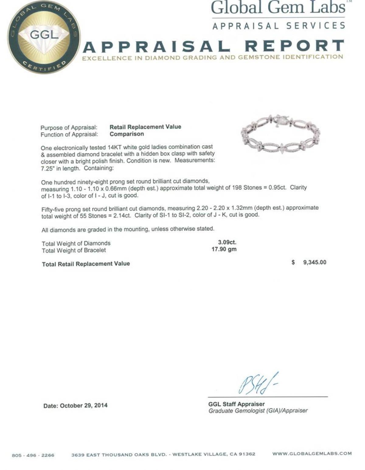 One electronically tested 14KT white gold ladies combination cast & assembled diamond bracelet with a hidden box clasp with safety closer with a bright polish finish. Measurements: 7.25 in length. Condition is new. Containing: One Hundred Ninety-Eight prong set round brilliant cut diamonds, measuring 1.10 - 1.10 x 0.66mm (depth est.) approximate total weight of 198 Stones = 0.95ct. Clarity: I-1 to I-3. Color: I - J, Cut is Good. Fifty-Five prong set round brilliant cut diamonds, measuring 2.20 - 2.20 x 1.32mm (depth est.) approximate total weight of 55 Stones = 2.14ct. Clarity: SI-1 to SI-2. Color: J - K, Cut is Good. All diamonds are graded in the mounting, unless otherwise stated. Total Weight of Diamonds 3.09ct. Total Weight of Bracelet 17.90 grams. GGL Appraised.