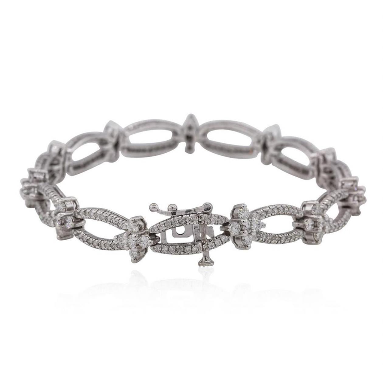 One electronically tested 14KT white gold ladies combination cast & assembled diamond bracelet with a hidden box clasp with safety closer with a bright polish finish. Measurements: 7.25 in length. Condition is new. Containing: One Hundred Ninety-Eight prong set round brilliant cut diamonds, measuring 1.10 - 1.10 x 0.66mm (depth est.) approximate total weight of 198 Stones = 0.95ct. Clarity: I-1 to I-3. Color: I - J, Cut is Good. Fifty-Five prong set round brilliant cut diamonds, measuring 2.20 - 2.20 x 1.32mm (depth est.) approximate total weight of 55 Stones = 2.14ct. Clarity: SI-1 to SI-2. Color: J - K, Cut is Good. All diamonds are graded in the mounting, unless otherwise stated. Total Weight of Diamonds 3.09ct. Total Weight of Bracelet 17.90 grams. GGL Appraised.