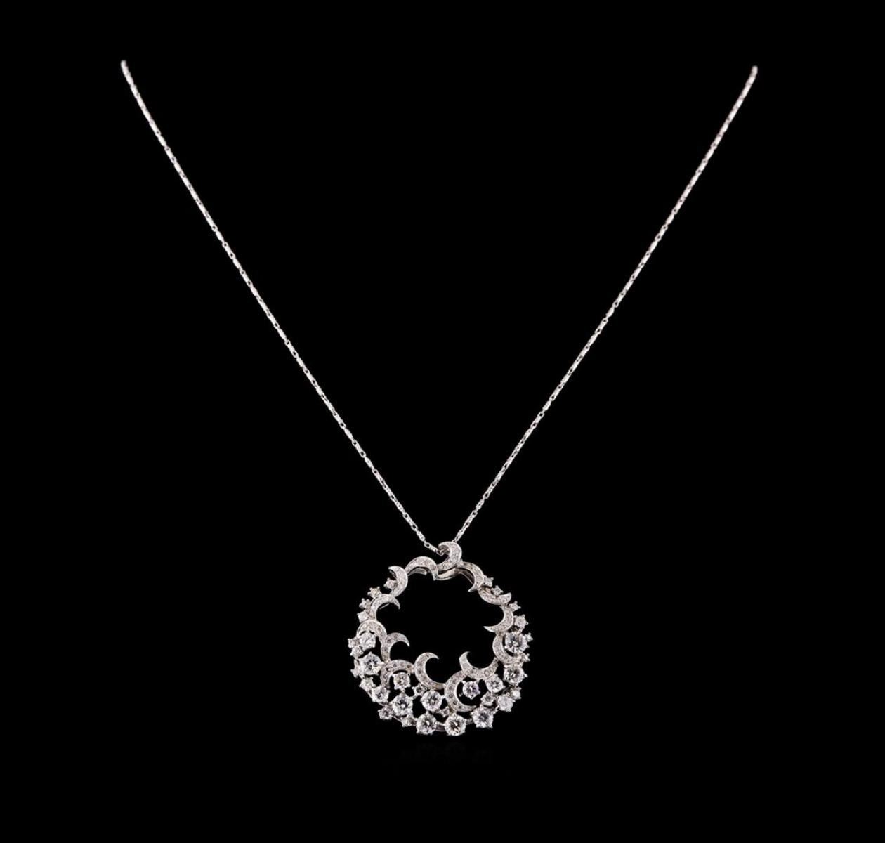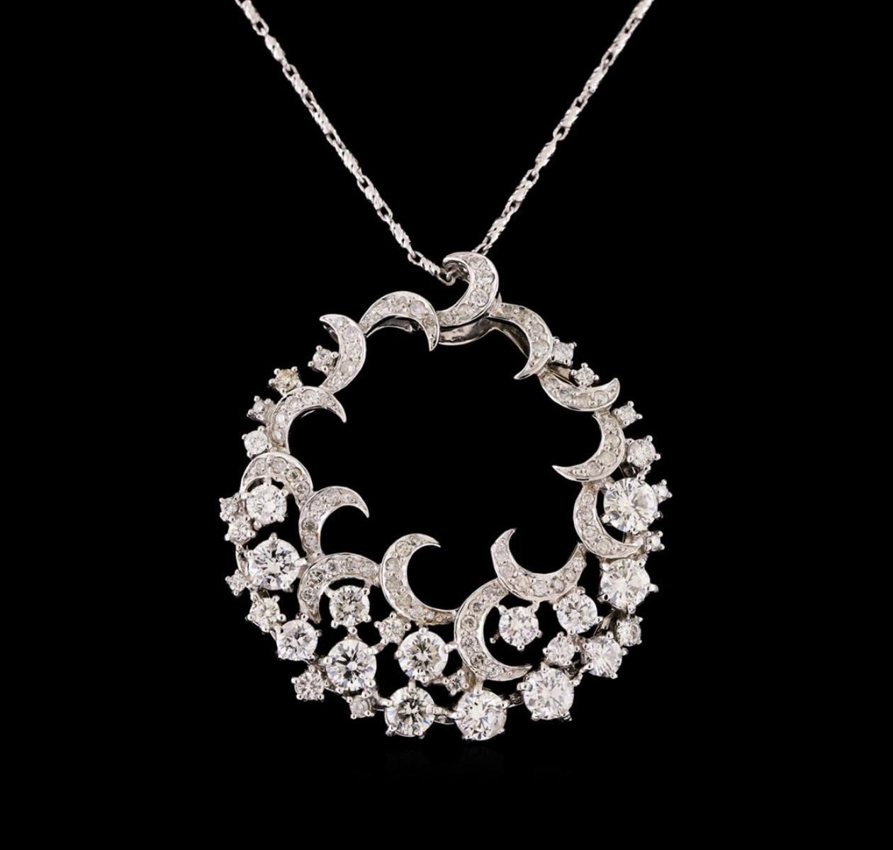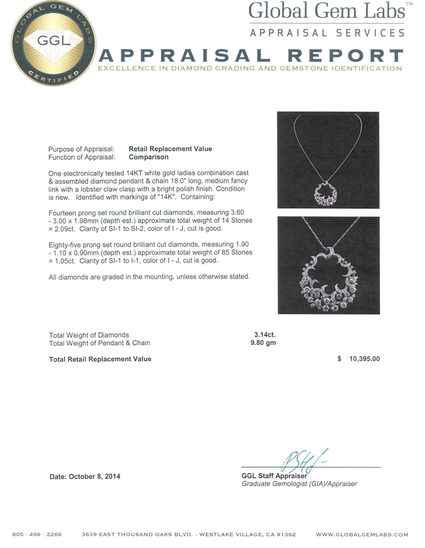 One electronically tested 14KT white gold ladies combination cast & assembled diamond pendant & chain 18.0" long, medium fancy link with a lobster claw clasp with a bright polish finish. Identified with markings of "14K". Condition is new. Containing: Fourteen prong set round brilliant cut diamonds, measuring 3.60 - 3.00 x 1.98mm (depth est.) approximate total weight of 14 Stones = 2.09ct. Clarity: SI-1 to SI-2. Color: I - J, Cut is Good. Eighty-Five prong set round brilliant cut diamonds, measuring 1.90 - 1.10 x 0.90mm (depth est.) approximate total weight of 85 Stones = 1.05ct. Clarity: SI-1 to I-1. Color: I - J, Cut is Good. All diamonds are graded in the mounting, unless otherwise stated. Total Weight of Diamonds 3.14ct. Total Weight of Pendant & Chain 9.80 grams. GGL Appraised.