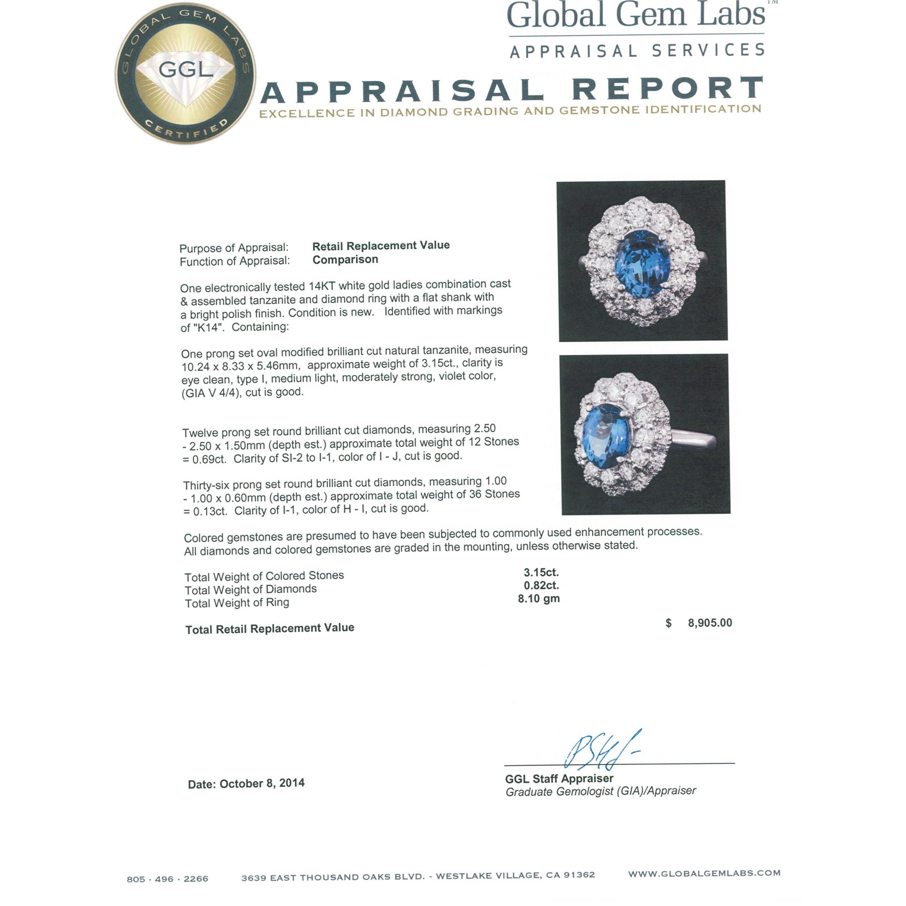 One electronically tested 14KT white gold ladies combination cast & assembled tanzanite and diamond ring with a flat shank with a bright polish finish. Identified with markings of "K14". Condition is new. Containing: One prong set oval modified brilliant cut natural tanzanite, measuring 10.24 x 8.33 x 5.46mm, approximate weight of 3.15ct., clarity is eye clean, type I, medium light, moderately strong, violet color, (GIA V 4/4), cut is good. Twelve prong set round brilliant cut diamonds, measuring 2.50 - 2.50 x 1.50mm (depth est.) approximate total weight of 12 Stones = 0.69ct. Clarity: SI-2 to I-1. Color: I - J, Cut is Good. Thirty-Six prong set round brilliant cut diamonds, measuring 1.00 - 1.00 x 0.60mm (depth est.) approximate total weight of 36 Stones = 0.13ct. Clarity: I-1. Color: H - I, Cut is Good. Colored gemstones are presumed to have been subjected to commonly used enhancement processes. All diamonds and colored gemstones are graded in the mounting, unless otherwise stated. Total Weight of Colored Stones 3.15ct. Total Weight of Diamonds 0.82ct. Total Weight of Ring 8.10 grams. GGL Appraised.