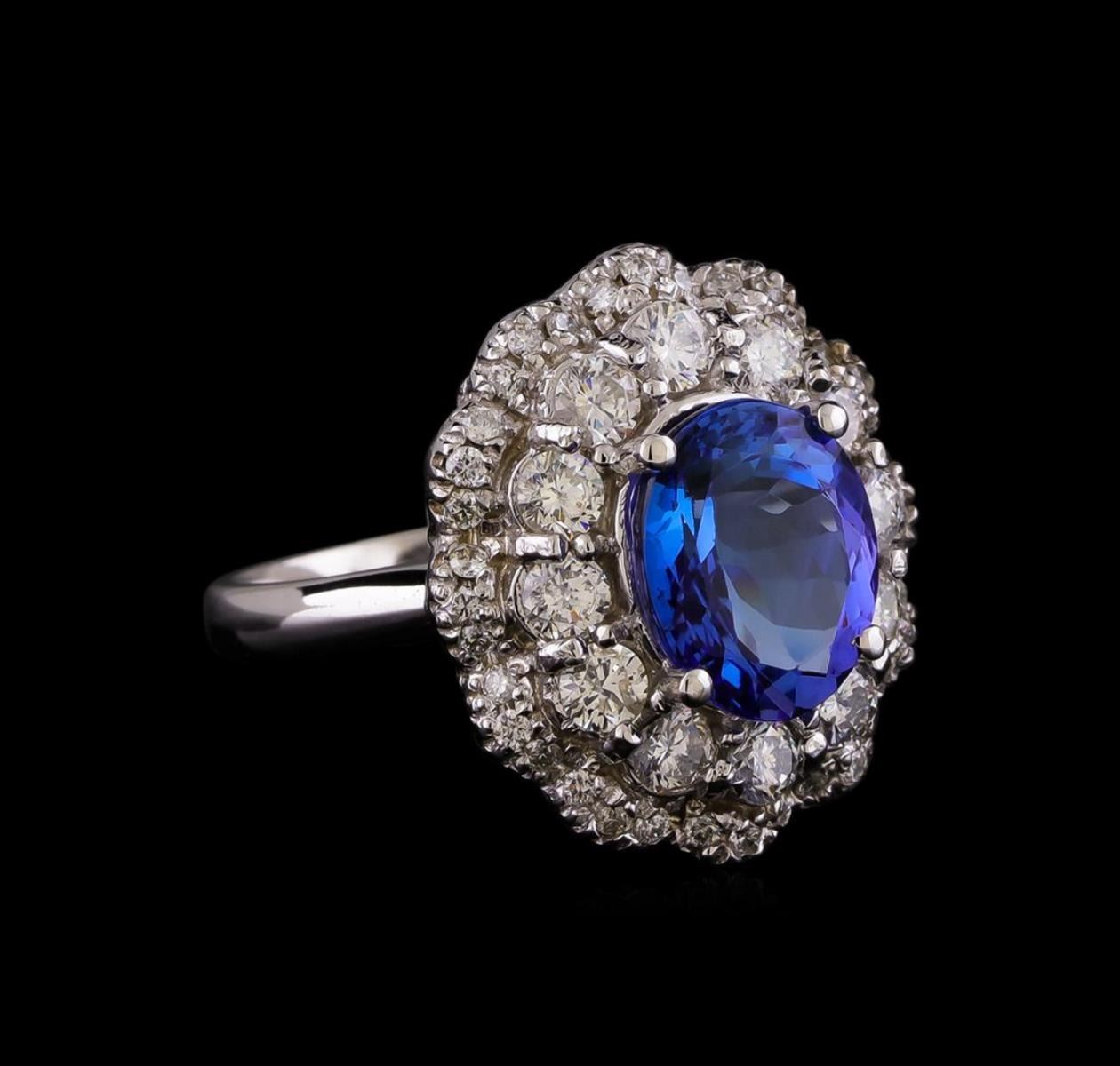 One electronically tested 14KT white gold ladies combination cast & assembled tanzanite and diamond ring with a flat shank with a bright polish finish. Identified with markings of "K14". Condition is new. Containing: One prong set oval modified brilliant cut natural tanzanite, measuring 10.24 x 8.33 x 5.46mm, approximate weight of 3.15ct., clarity is eye clean, type I, medium light, moderately strong, violet color, (GIA V 4/4), cut is good. Twelve prong set round brilliant cut diamonds, measuring 2.50 - 2.50 x 1.50mm (depth est.) approximate total weight of 12 Stones = 0.69ct. Clarity: SI-2 to I-1. Color: I - J, Cut is Good. Thirty-Six prong set round brilliant cut diamonds, measuring 1.00 - 1.00 x 0.60mm (depth est.) approximate total weight of 36 Stones = 0.13ct. Clarity: I-1. Color: H - I, Cut is Good. Colored gemstones are presumed to have been subjected to commonly used enhancement processes. All diamonds and colored gemstones are graded in the mounting, unless otherwise stated. Total Weight of Colored Stones 3.15ct. Total Weight of Diamonds 0.82ct. Total Weight of Ring 8.10 grams. GGL Appraised.