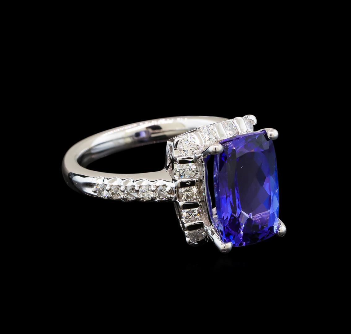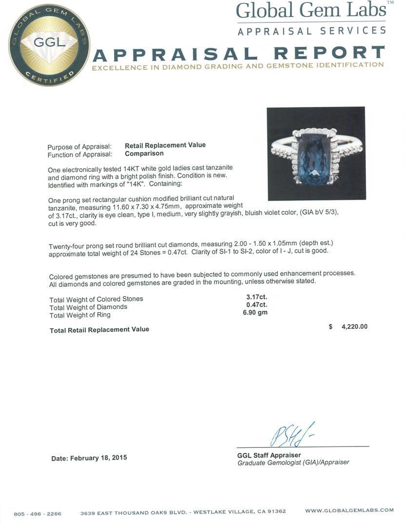 One electronically tested 14KT white gold ladies cast tanzanite and diamond ring with a bright polish finish. Identified with markings of "14K". Condition is new. Containing: One prong set rectangular cushion modified brilliant cut natural tanzanite, measuring 11.60 x 7.30 x 4.75mm, approximate weight of 3.17ct., clarity is eye clean, type I, medium, very slightly grayish, bluish violet color, (GIA bV 5/3), cut is very good. Twenty-Four prong set round brilliant cut diamonds, measuring 2.00 - 1.50 x 1.05mm (depth est.) approximate total weight of 24 Stones = 0.47ct. Clarity: SI-1 to SI-2. Color: I - J, Cut is Good. Colored gemstones are presumed to have been subjected to commonly used enhancement processes. All diamonds and colored gemstones are graded in the mounting, unless otherwise stated. Total Weight of Colored Stones 3.17ct. Total Weight of Diamonds 0.47ct. Total Weight of Ring 6.90 grams. GGL Appraised.