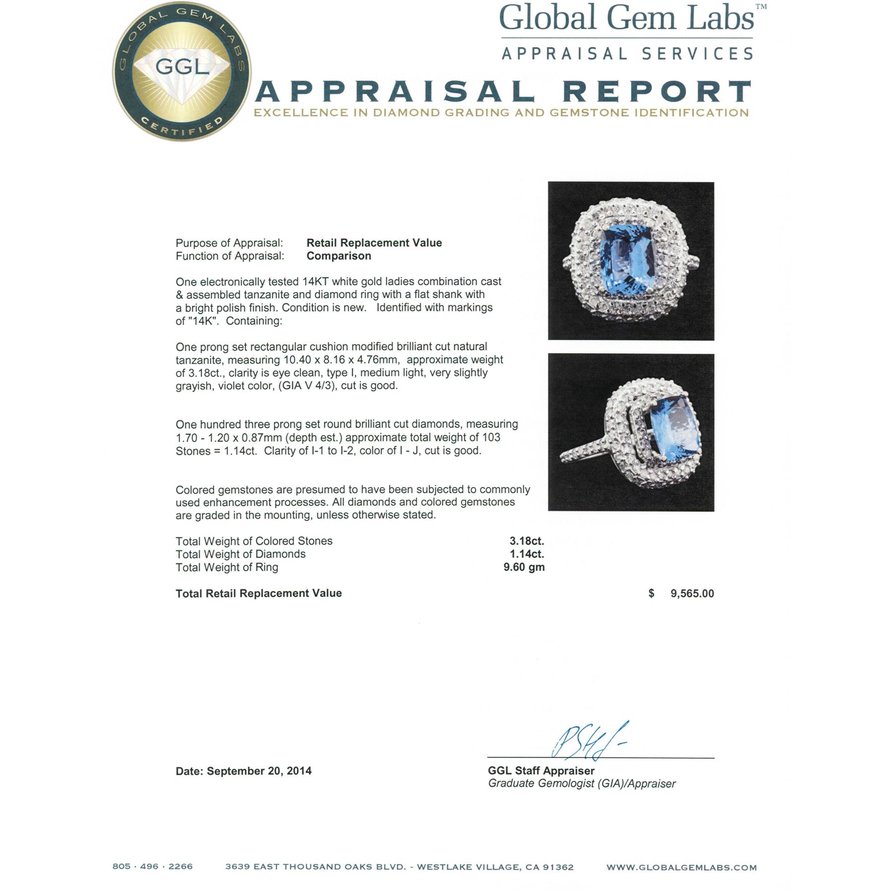 One electronically tested 14KT white gold ladies combination cast & assembled tanzanite and diamond ring with a flat shank with a bright polish finish. Identified with markings of "14K". Condition is new. Containing: One prong set rectangular cushion modified brilliant cut natural tanzanite, measuring 10.40 x 8.16 x 4.76mm, approximate weight of 3.18ct., clarity is eye clean, type I, medium light, very slightly grayish, violet color, (GIA V 4/3), cut is good. One Hundred Three prong set round brilliant cut diamonds, measuring 1.70 - 1.20 x 0.87mm (depth est.) approximate total weight of 103 Stones = 1.14ct. Clarity: I-1 to I-2. Color: I - J, Cut is Good. Colored gemstones are presumed to have been subjected to commonly used enhancement processes. All diamonds and colored gemstones are graded in the mounting, unless otherwise stated. Total Weight of Colored Stones 3.18ct. Total Weight of Diamonds 1.14ct. Total Weight of Ring 9.60 grams. GGL Appraised.