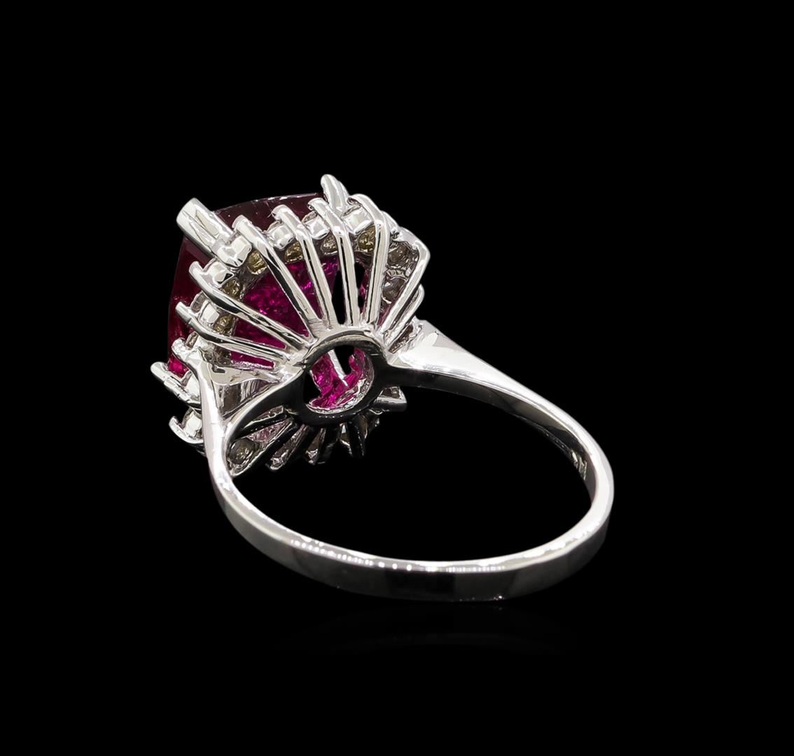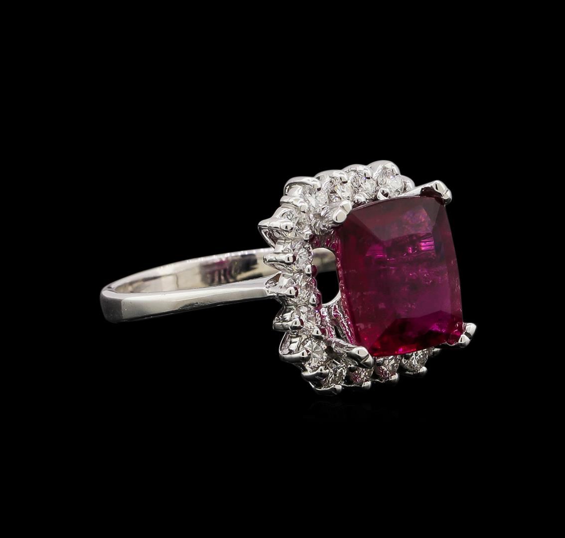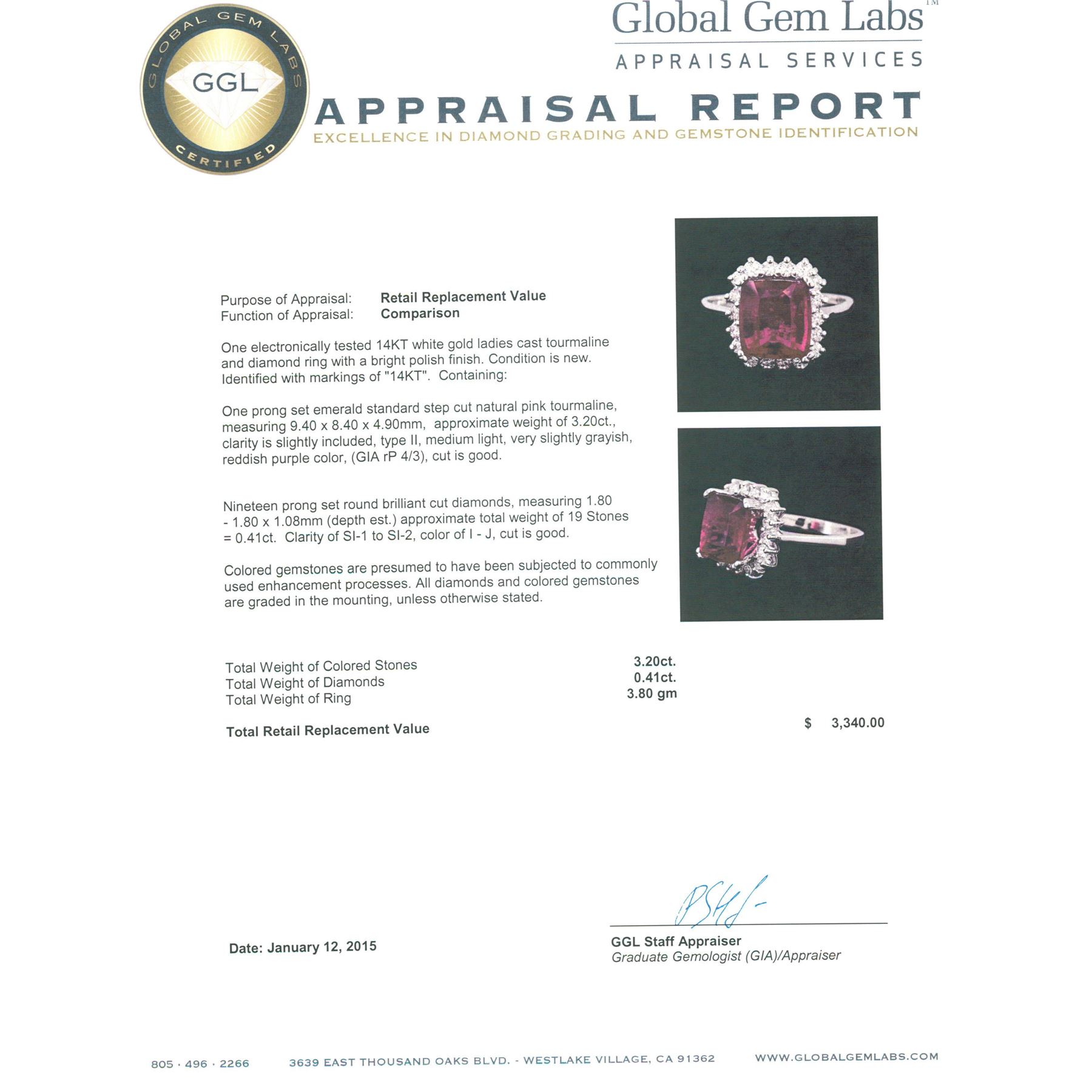 One electronically tested 14KT white gold ladies cast tourmaline and diamond ring with a bright polish finish. Identified with markings of "14KT". Condition is new. Containing: One prong set emerald standard step cut natural pink tourmaline, measuring 9.40 x 8.40 x 4.90mm, approximate weight of 3.20ct., clarity is slightly included, type II, medium light, very slightly grayish, reddish purple color, (GIA rP 4/3), cut is good. Nineteen prong set round brilliant cut diamonds, measuring 1.80 - 1.80 x 1.08mm (depth est.) approximate total weight of 19 Stones = 0.41ct. Clarity: SI-1 to SI-2. Color: I - J, Cut is Good. Colored gemstones are presumed to have been subjected to commonly used enhancement processes. All diamonds and colored gemstones are graded in the mounting, unless otherwise stated. Total Weight of Colored Stones 3.20ct. Total Weight of Diamonds 0.41ct. Total Weight of Ring 3.80 grams. GGL Appraised.