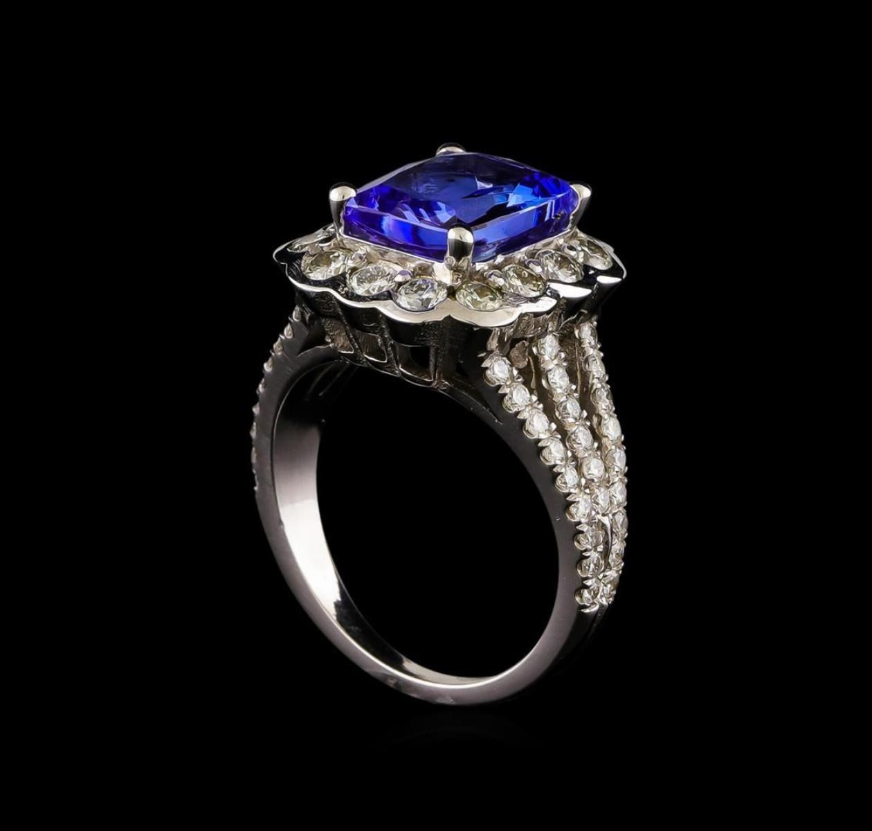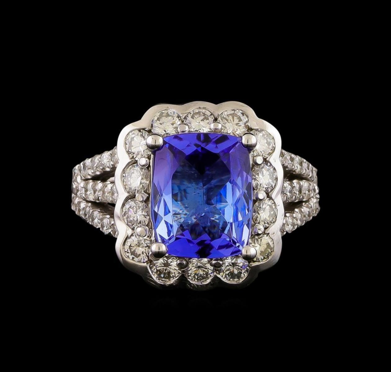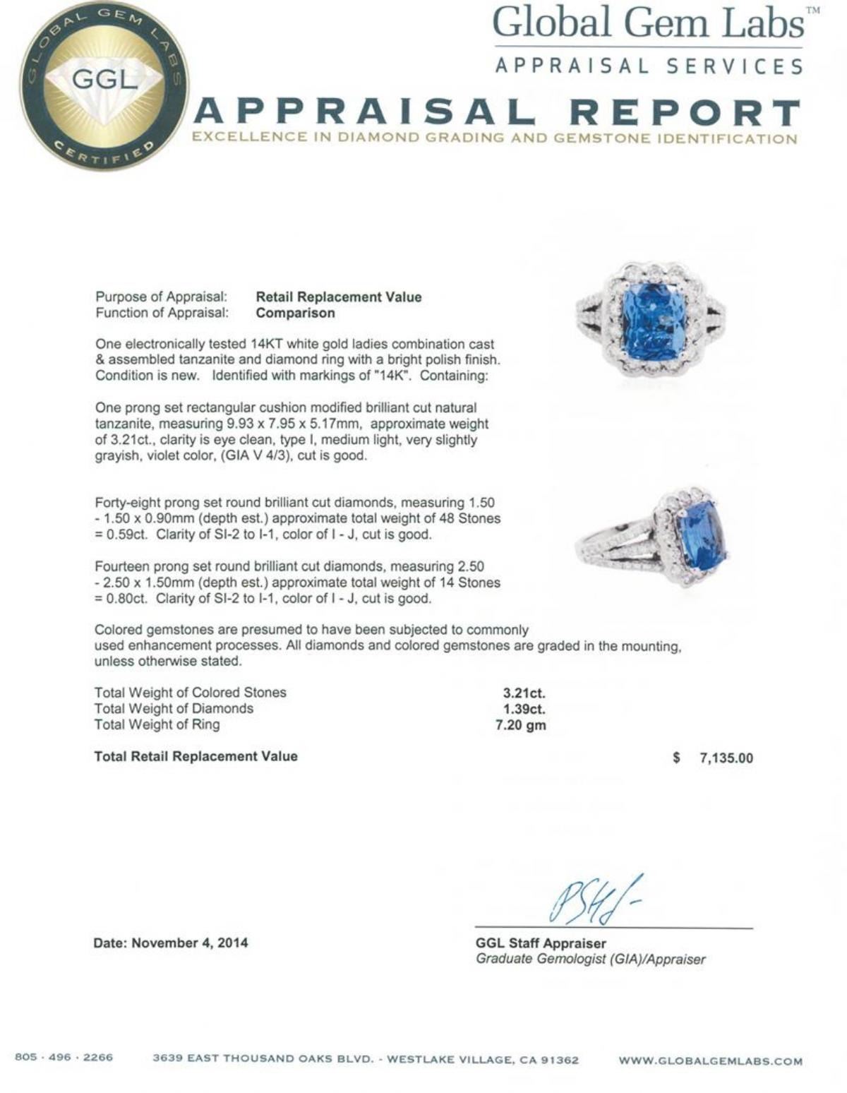 One electronically tested 14KT white gold ladies combination cast & assembled tanzanite and diamond ring with a bright polish finish. Identified with markings of "14K". Condition is new. Containing: One prong set rectangular cushion modified brilliant cut natural tanzanite, measuring 9.93 x 7.95 x 5.17mm, approximate weight of 3.21ct., clarity is eye clean, type I, medium light, very slightly grayish, violet color, (GIA V 4/3), cut is good. Forty-Eight prong set round brilliant cut diamonds, measuring 1.50 - 1.50 x 0.90mm (depth est.) approximate total weight of 48 Stones = 0.59ct. Clarity: SI-2 to I-1. Color: I - J, Cut is Good. Fourteen prong set round brilliant cut diamonds, measuring 2.50 - 2.50 x 1.50mm (depth est.) approximate total weight of 14 Stones = 0.80ct. Clarity: SI-2 to I-1. Color: I - J, Cut is Good. Colored gemstones are presumed to have been subjected to commonly used enhancement processes. All diamonds and colored gemstones are graded in the mounting, unless otherwise stated. Total Weight of Colored Stones 3.21ct. Total Weight of Diamonds 1.39ct. Total Weight of Ring 7.20 grams. GGL Appraised.