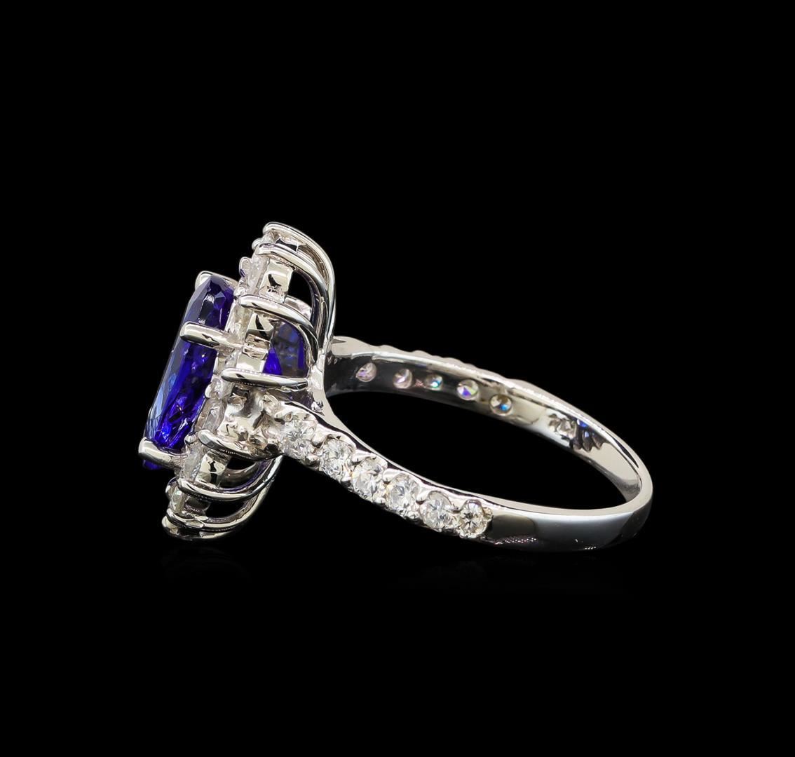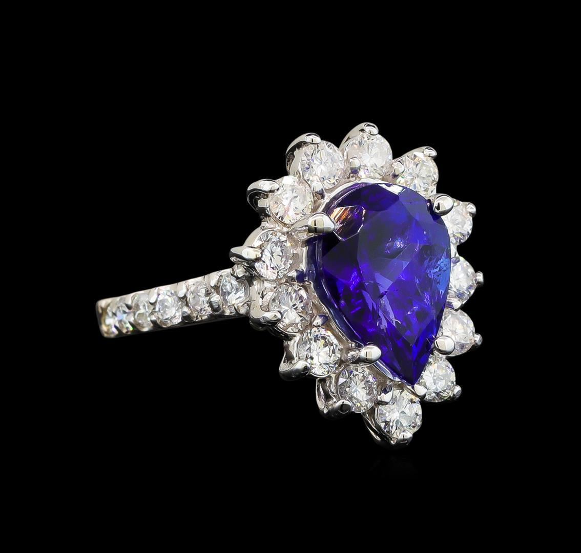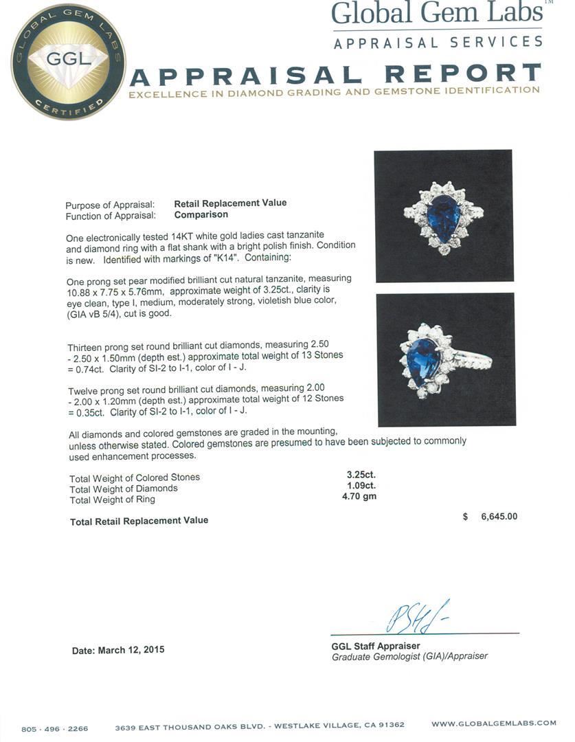 One electronically tested 14KT white gold ladies cast tanzanite and diamond ring with a flat shank with a bright polish finish. Identified with markings of "K14". Condition is new. Containing: One prong set pear modified brilliant cut natural tanzanite, measuring 10.88 x 7.75 x 5.76mm, approximate weight of 3.25ct., clarity is eye clean, type I, medium, moderately strong, violetish blue color, (GIA vB 5/4), cut is good. Thirteen prong set round brilliant cut diamonds, measuring 2.50 - 2.50 x 1.50mm (depth est.) approximate total weight of 13 Stones = 0.74ct. Clarity: SI-2 to I-1. Color: I - J. Twelve prong set round brilliant cut diamonds, measuring 2.00 - 2.00 x 1.20mm (depth est.) approximate total weight of 12 Stones = 0.35ct. Clarity: SI-2 to I-1. Color: I - J. All diamonds and colored gemstones are graded in the mounting, unless otherwise stated. Colored gemstones are presumed to have been subjected to commonly used enhancement processes. Total Weight of Colored Stones 3.25ct. Total Weight of Diamonds 1.09ct. Total Weight of Ring 4.70 grams. GGL Appraised.
