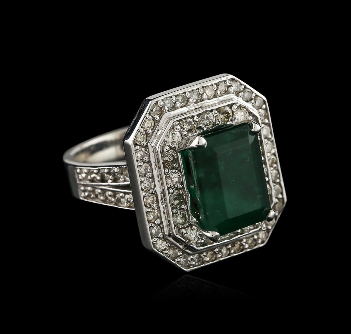 One electronically tested 14KT white gold ladies cast emerald and diamond ring with a bright polish finish. Identified with markings of "14K". Condition is new. Containing: One prong set oval emerald standard step cut natural emerald, measuring 11.82 x 6.10 x 6.20mm, approximate total weight of 3.28ct., clarity is heavily included, type III, medium dark, moderately strong, green color, (GIA G 6/4), cut is good. Seventy-Two prong set round brilliant cut diamonds, measuring 1.50 - 1.50 x 0.90mm (depth est.) approximate total weight of 72 Stones = 0.89ct. Clarity: I-1 to I-2. Color: I - J, Cut is Good. Diamonds and colored gemstones are graded in the mounting, unless otherwise stated. Colored gemstones are presumed to have been subjected to commonly used enhancement processes. Total Weight of Colored Stones 3.28ct. Total Weight of Diamonds 0.89ct. Total Weight of Ring 11.60 grams. GGL Appraised.