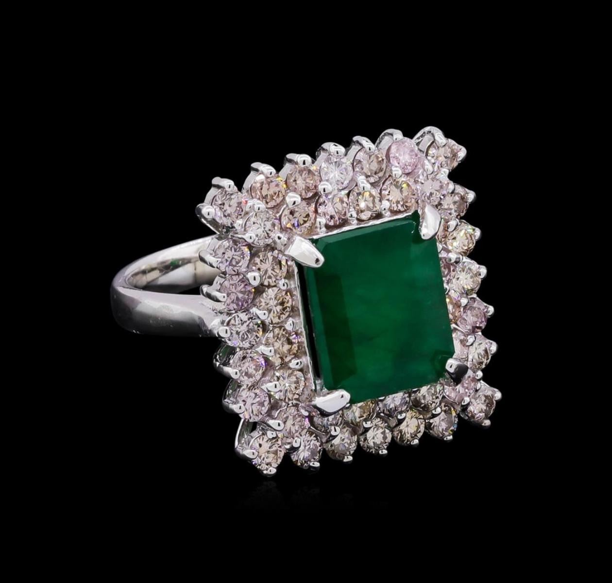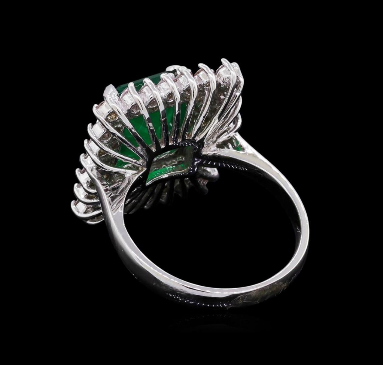 One electronically tested 14KT white gold ladies cast emerald and diamond ring with a bright polish finish. Condition is good. The featured emerald is set within a two tiered diamond lattice gallery, completed by a three millimeter wide band. Identified with markings of "K14". Containing: One prong set rectangular step cut natural emerald, measuring 9.80 x 8.25 x 4.80mm, approximate weight of 3.34ct., clarity is severely included, type III, medium dark, very slightly grayish, very slightly bluish green color, (GIA vslbG 6/3), cut is good. Transmitting light somewhat diffusely, translucent to opaque. Naturally occurring internal & external characteristics are present. Indications of oil residue. Graded in the setting. Forty-four prong set round brilliant cut diamonds, measuring 2.10 - 2.00 x 1.23mm (depth est.) approximate total weight of 44 Stones = 1.68ct. Graded in the setting. Clarity SI-1 to I-1. Color Very Light Brown. Total Weight of Colored Stones 3.34ct. Total Weight of Diamonds 1.68ct. Total Weight of Ring 7.80gm. AIG Appraised.