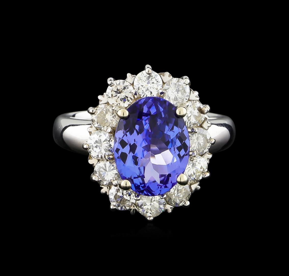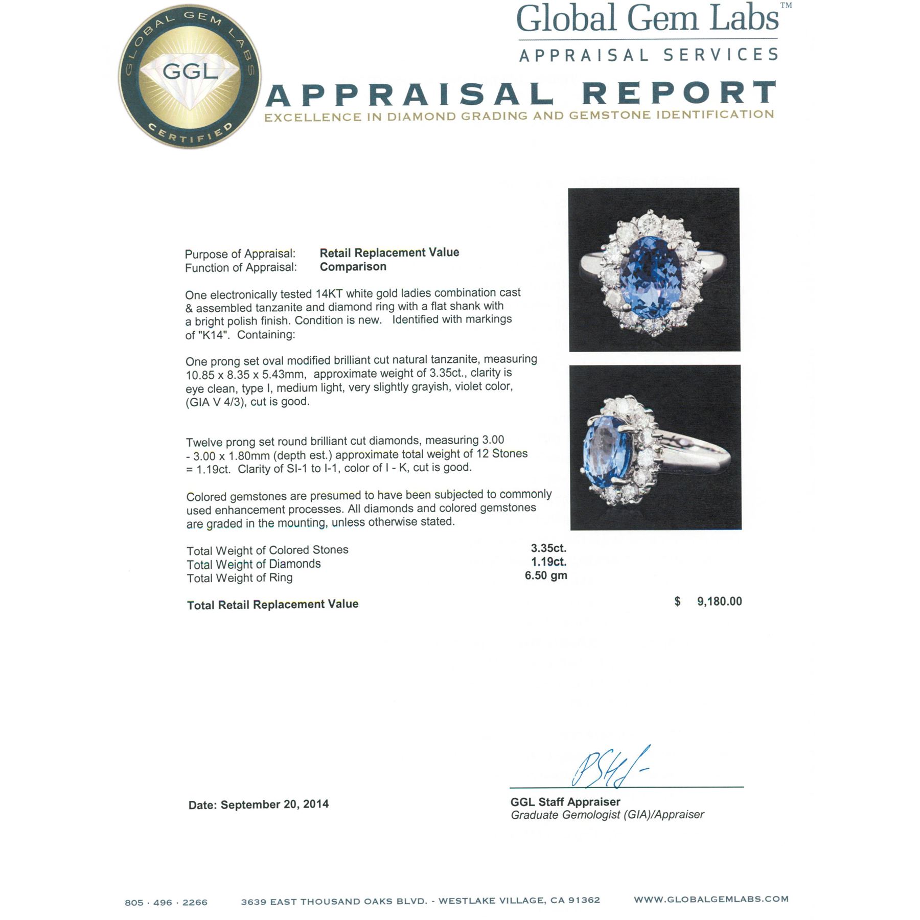 One electronically tested 14KT white gold ladies combination cast & assembled tanzanite and diamond ring with a flat shank with a bright polish finish. Identified with markings of "K14". Condition is new. Containing: One prong set oval modified brilliant cut natural tanzanite, measuring 10.85 x 8.35 x 5.43mm, approximate weight of 3.35ct., clarity is eye clean, type I, medium light, very slightly grayish, violet color, (GIA V 4/3), cut is good. Twelve prong set round brilliant cut diamonds, measuring 3.00 - 3.00 x 1.80mm (depth est.) approximate total weight of 12 Stones = 1.19ct. Clarity: SI-1 to I-1. Color: I - K, Cut is Good. Colored gemstones are presumed to have been subjected to commonly used enhancement processes. All diamonds and colored gemstones are graded in the mounting, unless otherwise stated. Total Weight of Colored Stones 3.35ct. Total Weight of Diamonds 1.19ct. Total Weight of Ring 6.50 grams. GGL Appraised.