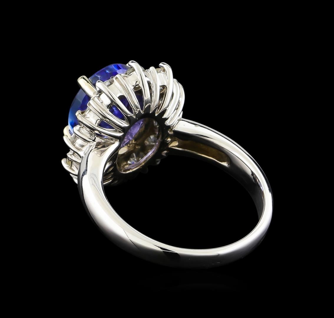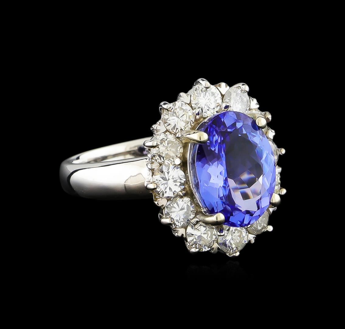 One electronically tested 14KT white gold ladies combination cast & assembled tanzanite and diamond ring with a flat shank with a bright polish finish. Identified with markings of "K14". Condition is new. Containing: One prong set oval modified brilliant cut natural tanzanite, measuring 10.85 x 8.35 x 5.43mm, approximate weight of 3.35ct., clarity is eye clean, type I, medium light, very slightly grayish, violet color, (GIA V 4/3), cut is good. Twelve prong set round brilliant cut diamonds, measuring 3.00 - 3.00 x 1.80mm (depth est.) approximate total weight of 12 Stones = 1.19ct. Clarity: SI-1 to I-1. Color: I - K, Cut is Good. Colored gemstones are presumed to have been subjected to commonly used enhancement processes. All diamonds and colored gemstones are graded in the mounting, unless otherwise stated. Total Weight of Colored Stones 3.35ct. Total Weight of Diamonds 1.19ct. Total Weight of Ring 6.50 grams. GGL Appraised.